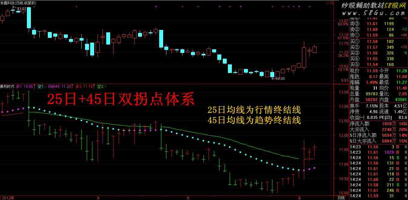 CC:=(CLOSE+HIGH+LOW)/3; AA:=EMA(CC,25); BB:=REF(AA,1); 多1:IF(AA>BB,BB,DRAWNULL),CIRCLEDOT,COLORMAGENTA; 空1:IF(AA<BB,BB,DRAWNULL),CIRCLEDOT,COLORCYAN; EMA45:EMA(CC,45),NODRAW; DD:=REF(EMA45,1); 多2:IF(EMA45>DD,DD,DRAWNULL),COLORRED; 空2:IF(EMA45<DD,DD,DRAWNULL),COLORGREEN; STICKLINE(CLOSE>=OPEN,CLOSE,CLOSE,2,1),COLORRED; STICKLINE(CLOSE>=OPEN,LOW,HIGH,0,1),COLORRED; STICKLINE(CLOSE<=OPEN,LOW,HIGH,0,1),COLORGREEN; STICKLINE(CLOSE<=OPEN,CLOSE,CLOSE,2,1),COLORGREEN; |