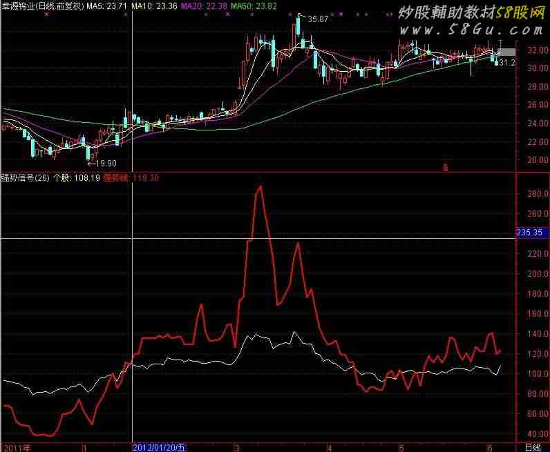 黄色线为个股股价线,红色线为强势线,在强势线上穿个股线时,意味着后市将有一波的主升浪行情强势信号N (2 100 26)个股:MA(C,1)/MA(REF(C,18),18)*100,COLOR00FFFF;