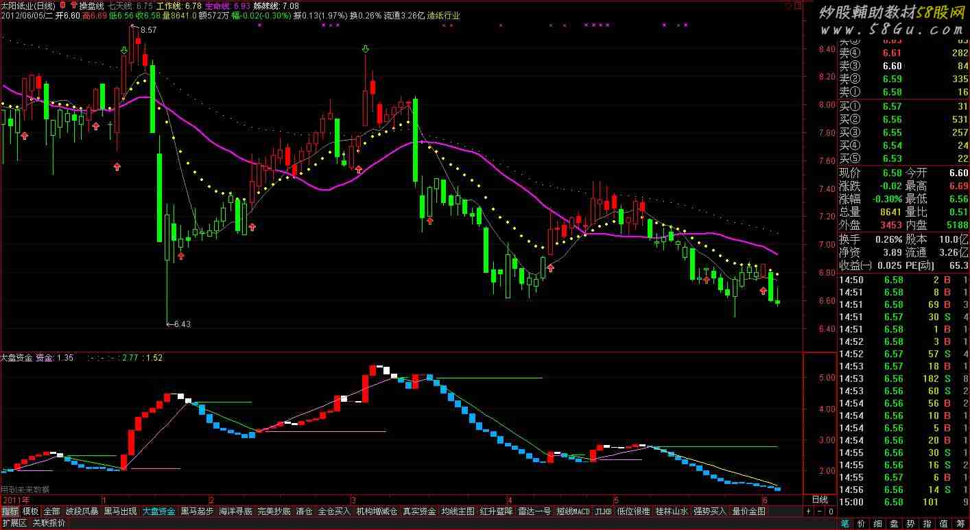 七天线:MA(C,7),COLORGRAY; 工作线:(EMA(C,14)),POINTDOT,LINETHICK4,COLORYELLOW; 生命线:(MA(C,25)),LINETHICK2,COLORMAGENTA; {不惑线:(MA(C,40)),COLORCYAN; } 姊妹线:(EMA(C,56)),POINTDOT,COLORWHITE; A3:=EMA((((SLOPE(C,21)) * 20) + C),68); A4:=EMA(C,10); A5:=REF(C,2); A6:=((SMA((MAX((C - A5),0)),6,1)) / (SMA(ABS((C - A5)),6,1))) * 100; A7:=IF(((A6 < (REF(A6,1))) AND (A6 > 79)),A6,0); A8:=LLV(L,21); A9:=HHV(H,21); A10:=EMA((((CLOSE - A8) / (A9 - A8)) * 100),5); A11:=EMA((((CLOSE - A8) / (A9 - A8)) * 50),13); A12:=EMA(((0.667 * (REF(A10,1))) + (0.333 * A10)),2); A13:=LLV(L,55); A14:=HHV(H,34); A15:=EMA((((C - A13) / (A14 - A13)) * 100),3); A16:=(A11 + A15) / 2; A17:=EMA(((0.667 * (REF(A15,1))) + (0.333 * A10)),2); A18:=EMA(A16,5); A19:=EMA(((0.667 * (REF(A18,1))) + (0.333 * A18)),2); A20:=CROSS(A10,A11); A21:=(CROSS(A10,A19)) AND (A19 < 30); A22:=A21 * 0.6; A23:=((C + L) + H) / 3; A24:=EMA(A23,6); A25:=EMA(A24,5); A26:=CROSS(A24,A25); DRAWICON(A26,(LOW / 1.015),1),LINETHICK2,COLORMAGENTA; STICKLINE(((C >= 工作线) AND (C >= O)),H,L,0,1),COLORRED; STICKLINE(((C >= 工作线) AND (C >= O)),O,C,2,1),COLORRED; STICKLINE(((C >= 工作线) AND (C <= O)),H,L,0,0),COLORRED; STICKLINE(((C >= 工作线) AND (C <= O)),O,C,2,0),COLORRED; STICKLINE(((C < 工作线) AND (C >= O)),H,L,0,1),COLORGREEN; STICKLINE(((C < 工作线) AND (C >= O)),O,C,2,1),COLORGREEN; STICKLINE(((C < 工作线) AND (C <= O)),H,L,0,0),COLORGREEN; STICKLINE(((C < 工作线) AND (C <= O)),O,C,2,0),COLORGREEN;