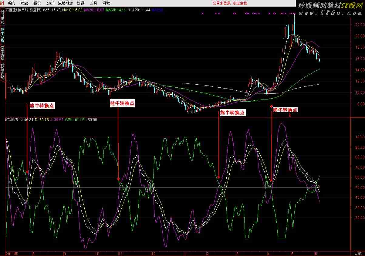 RSV:=(CLOSE-LLV(LOW,34))/(HHV(HIGH,34)-LLV(LOW,34))*100; K:SMA(RSV,3,1); D:SMA(K,3,1); J:3*K-2*D; WR1:100*(HHV(HIGH,34)-CLOSE)/(HHV(HIGH,34)-LLV(LOW,34)); 50;做股票识别熊牛转换点很重要,关系到进场决策和资金安全。传统KDJ指标由于先天缺陷常在下跌过程中出金叉,股民按此信号进场常吃套。为此我将KDJ参数和WR参数进行了修改优化,并把两个指标合并成一个指标,利用J线上穿50加WR线同步下穿50作为熊牛转换点进场信号,这样可过滤掉许多KDJ无益的金叉信号,避免盲目抄底带来的风险,提高了资金的安全性。