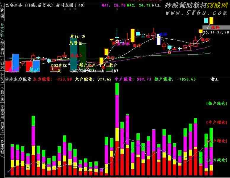 指标原码 主力:=L2_AMO(0,2)/10000.0; 大户:=L2_AMO(1,2)/10000.0; 中户:=L2_AMO(2,2)/10000.0; 散户:=L2_AMO(3,2)/10000.0; 均量:=(主力+大户+中户+散户)/4; 主力能量:(主力-均量),COLORRED,NODRAW; 主力能量柱:STICKLINE(主力能量,0,ABS(主力能量),2,0),COLORRED;大户能量:(大户-均量),NODRAW; 大户能量柱:STICKLINE(大户能量,ABS(主力能量),ABS(主力能量)+ABS(大户能量),2,0),COLORYELLOW;{中户持仓量} 中户能量:(中户-均量),NODRAW; 中户能量柱:STICKLINE(中户能量,ABS(主力能量)+ABS(大户能量),ABS(主力能量)+ABS(大户能量)+ABS(中户能量),2,0),COLORMAGENTA;{散户持仓量} 散户能量:(散户-均量),NODRAW; 散户能量柱:STICKLINE(散户能量,ABS(主力能量)+ABS(大户能量)+ABS(中户能量),ABS(主力能量)+ABS(大户能量)+ABS(中户能量)+ABS(散户能量),2,0),COLORGREEN;{主导力量}DRAWTEXT_FIX(ISLASTBAR=1 AND 主力能量>=0,0.89,0.8,0,'[主力增仓]'),COLORRED; DRAWTEXT_FIX(ISLASTBAR=1 AND 主力能量<0,0.89,0.8,0,'[主力减仓]'),COLORGREEN; DRAWTEXT_FIX(ISLASTBAR=1 AND 大户能量>=0,0.89,0.6,0,'[大户增仓]'),COLORRED; DRAWTEXT_FIX(ISLASTBAR=1 AND 大户能量<0,0.89,0.6,0,'[大户减仓]'),COLORGREEN; DRAWTEXT_FIX(ISLASTBAR=1 AND 中户能量>=0,0.89,0.4,0,'[中户增仓]'),COLORRED; DRAWTEXT_FIX(ISLASTBAR=1 AND 中户能量<0,0.89,0.4,0,'[中户减仓]'),COLORGREEN; DRAWTEXT_FIX(ISLASTBAR=1 AND 散户能量>=0,0.89,0.2,0,'[散户增仓]'),COLORRED; DRAWTEXT_FIX(ISLASTBAR=1 AND 散户能量<0,0.89,0.2,0,'[散户减仓]'),COLORGREEN; 量3:MA(均量,3); 量7:MA(均量,7);