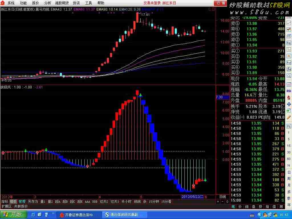 1,DOTLINE; -1,DOTLINE; DIFF:=EMA(CLOSE,21)-EMA(CLOSE,34); DEA:=EMA(DIFF,8); MACD:=20*(DIFF-DEA); MARD:=SMA(MACD,2,1); MARD,COLORSTICK; STICKLINE(MACD>MARD,MACD,MARD,3,0),COLOR0000FF; STICKLINE(MACD<MARD,MACD,MARD,5,0),COLORFF0000; DRAWICON(CROSS(MACD,MARD),MACD,1); DRAWICON(CROSS(MARD,MACD),MARD,2); |