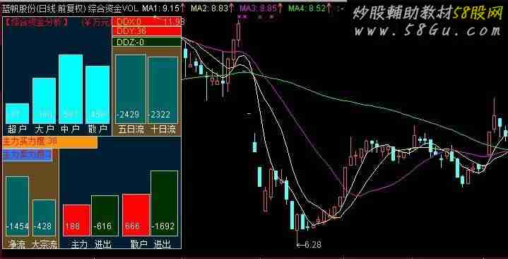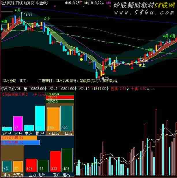预测量:=IF(CURRBARSCOUNT=1 AND PERIOD=5,VOL*240/FROMOPEN,VOL),NODRAW; STICKLINE(CURRBARSCOUNT=1 AND PERIOD=5,预测量,0,-1,-1),COLOR00C0C0; 量:VOL,VOLSTICK; VOL5:MA(量,5); VOL10:MA(量,10); 五换:SUM(100*V/CAPITAL,5),COLORRED,NODRAW; 十换:SUM(100*V/CAPITAL,10),COLORRED,NODRAW; 超B:=L2_AMO(0,2)/10000.0; 大B:=L2_AMO(1,2)/10000.0; 中B:=L2_AMO(2,2)/10000.0; 小B:=L2_AMO(3,2)/10000.0; 超S:=-L2_AMO(0,3)/10000.0; 大S:=-L2_AMO(1,3)/10000.0; 中S:=-L2_AMO(2,3)/10000.0; 小S:=-L2_AMO(3,3)/10000.0; TESTSKIP(NOT(超B OR 大B OR 中B OR 小B OR 超S OR 大S OR 中S OR 小S)!=0); 净流入:=(超B+大B+中B+小B)+(超S+大S+中S+小S); 大宗净流入:=(超B+大B)+(超S+大S); 超大单:=(超B)+(超S); 大单:=(大B)+(大S); 中单:=(中B)+(中S); 小单:=(小B)+(小S); 大宗进:=(超B)+(大B); 大宗出:=(超S)+(大S); 非大宗进:=(中B)+(小B); 非大宗出:=(中S)+(小S); 资金流向:=(超B+大B+中B+小B)+(超S+大S+中S+小S); 近5日流向:=SUM(资金流向,5); 近10日流向:=SUM(资金流向,10); 主力资金线:=(L2_AMO(0,0)+L2_AMO(1,0)-L2_AMO(0,1)-L2_AMO(1,1))/100.0,LINETHICK2; 主力买力度:=LARGEINTRDVOL*100/VOL; 主力卖力度:=LARGEOUTTRDVOL*100/VOL; DRAWRECTREL(0,0,235,999,RGB(100,330,30)); DRAWRECTREL(0,0,235,515,RGB(0,30,50)); DRAWRECTREL(75,515,235,999,RGB(0,30,50)); DRAWRECTREL(144,0,235,515,RGB(100,330,30));AA:=CONST(MAX(ABS(净流入),MAX(ABS(大宗净流入),MAX(ABS(大宗进),MAX(ABS(大宗出),MAX(ABS(非大宗进),ABS(非大宗出)))))))*3,NODRAW; DRAWRECTREL(5,CONST(830-(ABS(净流入)*500/AA)),35,945,IF(CONST(净流入)>0,RGB(250,150,10),RGB(0,100,100))); DRAWRECTREL(40,CONST(830-(ABS(大宗净流入)*500/AA)),70,945,IF(CONST(大宗净流入)>0,RGB(250,150,10),RGB(0,100,100))); DRAWNUMBER_FIX(CURRBARSCOUNT=1,0.005,0.88,0,INTPART(净流入)),COLORWHITE; DRAWNUMBER_FIX(CURRBARSCOUNT=1,0.041,0.88,0,INTPART(大宗净流入)),COLORWHITE; DRAWTEXT_FIX(CURRBARSCOUNT=1,0.008,1,0,'净流 大宗流'),COLORWHITE;DRAWRECTREL(80,CONST(830-(ABS(大宗进)*500/AA)),115,945,IF(CONST(大宗进)>0,RGB(255,0,0),RGB(23,125,255))); DRAWRECTREL(117,CONST(830-(ABS(大宗出)*500/AA)),152,945,IF(CONST(大宗出)<0,RGB(0,50,0),RGB(0,50,0))); DRAWRECTREL(158,CONST(830-(ABS(非大宗进)*500/AA)),193,945,IF(CONST(非大宗进)>0,RGB(255,0,0),RGB(23,125,255))); DRAWRECTREL(195,CONST(830-(ABS(非大宗出)*500/AA)),230,945,IF(CONST(非大宗出)<0,RGB(0,50,0),RGB(0,50,0))); DRAWTEXT_FIX(CURRBARSCOUNT=1,0.09,1,0,'主力 进出 散户 进出'),COLORWHITE; DRAWNUMBER_FIX(CURRBARSCOUNT=1,0.082,0.88,0,INTPART(大宗进)),COLORWHITE; DRAWNUMBER_FIX(CURRBARSCOUNT=1,0.12,0.88,0,INTPART(大宗出)),COLORWHITE; DRAWNUMBER_FIX(CURRBARSCOUNT=1,0.161,0.88,0,INTPART(非大宗进)),COLORWHITE; DRAWNUMBER_FIX(CURRBARSCOUNT=1,0.196,0.88,0,INTPART(非大宗出)),COLORWHITE; AAB:=CONST(MAX(ABS(超大单),MAX(ABS(大单),MAX(ABS(中单),ABS(小单))))),NODRAW; DRAWRECTREL(5,CONST(830-(ABS(超大单)*500/AAB))/2,35,460,IF(CONST(超大单)>0,RGB(255,0,255),RGB(0,255,255))); DRAWRECTREL(40,CONST(830-(ABS(大单)*500/AAB))/2,70,460,IF(CONST(大单)>0,RGB(255,0,255),RGB(0,255,255))); DRAWRECTREL(75,CONST(830-(ABS(中单)*500/AAB))/2,105,460,IF(CONST(中单)>0,RGB(255,0,255),RGB(0,255,255))); DRAWRECTREL(110,CONST(830-(ABS(小单)*500/AAB))/2,140,460,IF(CONST(小单)>0,RGB(255,0,255),RGB(0,255,255))); DRAWTEXT_FIX(CURRBARSCOUNT=1,0.007,0.46,0,'超 户 大 户 中 户 散 户'),COLORWHITE; DRAWNUMBER_FIX(CURRBARSCOUNT=1,0.007,0.4,0,INTPART(超大单)),COLORWHITE; DRAWNUMBER_FIX(CURRBARSCOUNT=1,0.042,0.4,0,INTPART(大单)),COLORWHITE; DRAWNUMBER_FIX(CURRBARSCOUNT=1,0.076,0.4,0,INTPART(中单)),COLORWHITE; DRAWNUMBER_FIX(CURRBARSCOUNT=1,0.112,0.4,0,INTPART(小单)),COLORWHITE; DRAWTEXT_FIX(CURRBARSCOUNT=1,0,0,0,'【综合资金分析】 (¥万元)'),COLORRED; AAC:=CONST(MAX(ABS(近5日流向),ABS(近10日流向))),NODRAW; DRAWRECTREL(149,CONST(830-(ABS(近5日流向)*500/AAC))/2,189,460,IF(CONST(近5日流向)>0,RGB(250,150,10),RGB(0,100,100))); DRAWRECTREL(191,CONST(830-(ABS(近10日流向)*500/AAC))/2,230,460,IF(CONST(近10日流向)>0,RGB(250,150,10),RGB(0,100,100))); DRAWNUMBER_FIX(CURRBARSCOUNT=1,0.15,0.4,0,INTPART(近5日流向)),COLORWHITE; DRAWNUMBER_FIX(CURRBARSCOUNT=1,0.19,0.4,0,INTPART(近10日流向)),COLORWHITE; DRAWTEXT_FIX(CURRBARSCOUNT=1,0.152,0.46,0,'五日流 十日流'),COLORWHITE; DDX:=(LARGEINTRDVOL-LARGEOUTTRDVOL)*1000/FINANCE(7); DDY:=IF(TRADENUM>0,(TRADEOUTNUM-TRADEINNUM)*100/TRADENUM,0); DDZ:=IF(TRADENUM>0,(LARGETRDINNUM-LARGETRDOUTNUM)/TRADENUM*100,0); DRAWRECTREL(144,0,235,40,IF(CONST(DDX)>0,RGB(255,0,0),RGB(0,50,0))); DRAWRECTREL(144,45,235,85,IF(CONST(DDY)>0,RGB(255,0,0),RGB(0,50,0))); DRAWRECTREL(144,90,235,130,IF(CONST(DDZ)>0,RGB(255,0,0),RGB(0,50,0))); DRAWTEXT_FIX(1,0.15,0,0,STRCAT('DDX:',CON2STR(DDX,0))),COLORYELLOW; DRAWTEXT_FIX(1,0.15,0.04,0,STRCAT('DDY:',CON2STR(DDY,0))),COLORYELLOW; DRAWTEXT_FIX(1,0.15,0.09,0,STRCAT('DDZ:',CON2STR(DDZ,0))),COLORYELLOW; AAD:=CONST(MAX(ABS(主力买力度),ABS(主力卖力度)))*4,NODRAW; DRAWRECTREL(0,515,CONST(ABS(主力买力度)*500/AAD),568,IF(CONST(主力买力度)>0,RGB(250,150,10),RGB(0,255,255))); DRAWRECTREL(0,570,CONST(ABS(主力卖力度)*500/AAD),623,IF(CONST(主力卖力度)>0,RGB(23,125,255),RGB(0,255,255))); DRAWTEXT_FIX(1,0,0.512,0,STRCAT('主力买力度:',CON2STR(主力买力度,0))),COLORRED; DRAWTEXT_FIX(1,0,0.57,0,STRCAT('主力卖力度:',CON2STR(主力卖力度,0))),COLORRED;  |