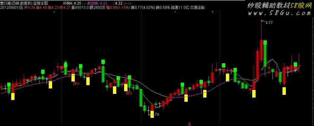 B1:=REF(C,1); B2:=REF(C,2); SS:=IF(C>REF(C,1) AND REF(C,1)>=REF(C,2),1,IF(C<REF(C,1) AND REF(C,1)<=REF(C,2),-1,IF(C>REF(C,2) AND REF(C,2)>REF(C,1),2,IF(C<REF(C,2) AND REF(C,2)<REF(C,1),-2,0)))); SM:=IF(REF(SS,1)!=0,REF(SS,1),IF(REF(SS,2)!=0,REF(SS,2),IF(REF(SS,3)!=0,REF(SS,3),IF(REF(SS,5)!=0,REF(SS,5),IF(REF(SS,6)!=0,REF(SS,6),IF(REF(SS,7)!=0,REF(SS,7),0)))))); STICKLINE(SS=1 OR SM>=1 AND SS=0,B1,C,3,0),COLORRED; STICKLINE(SS=2,B2,C,3,0),COLORRED; STICKLINE((SS=-1 OR SS=-2) AND SM>0,B2,B1,3,0),COLORRED; AA:=CLOSE>REF(CLOSE,1) AND REF(CLOSE,1)>REF(CLOSE,2) AND REF(CLOSE,1)<REF(CLOSE,3) AND IF(REF(CLOSE,3)<REF(CLOSE,4),1,IF(REF(CLOSE,4)<REF(CLOSE,5),REF(CLOSE,1)<REF(CLOSE,4) OR (REF(CLOSE,2)<REF(CLOSE,4) AND REF(CLOSE,3)>=REF(CLOSE,5)),IF(REF(CLOSE,5)<REF(CLOSE,6),1,REF(CLOSE,6)<REF(CLOSE,7)))); BB:=CLOSE<REF(CLOSE,1) AND REF(CLOSE,1)<REF(CLOSE,2) AND REF(CLOSE,1)>REF(CLOSE,3) AND IF(REF(CLOSE,3)>REF(CLOSE,4),1,IF(REF(CLOSE,4)>REF(CLOSE,5),REF(CLOSE,1)>REF(CLOSE,4) OR (REF(CLOSE,2)>REF(CLOSE,4) AND REF(CLOSE,3)<=REF(CLOSE,5)),IF(REF(CLOSE,5)>REF(CLOSE,6),1,REF(CLOSE,6)>REF(CLOSE,7)))); DRAWICON(AA AND CLOSE>REF(OPEN,3),0.99*LOW,1); DRAWICON(BB AND CLOSE<REF(CLOSE,3),HIGH*1.01,2); DRAWTEXT(AA AND CLOSE>REF(OPEN,3),LOW*0.98,'三平底翻红'),COLORRED; DRAWTEXT(BB AND CLOSE<REF(CLOSE,3),HIGH*1.02,'三平顶翻绿'),COLORGREEN; {HTTP://WWW.55188.COM/INDEX.PHP 理想论坛_通达信股票指标公式} VAR1:=CLOSE>REF(CLOSE,1) AND CLOSE>REF(CLOSE,2); VAR2:=REF(VAR1,1) AND CLOSE<=REF(CLOSE,1) AND CLOSE>=REF(CLOSE,2); VAR3:=REF(VAR2,1) AND CLOSE>=REF(CLOSE,1) AND CLOSE<=REF(CLOSE,2); VAR4:=REF(VAR3,1) AND CLOSE<=REF(CLOSE,1) AND CLOSE>=REF(CLOSE,2); VAR5:=REF(VAR4,1) AND CLOSE>=REF(CLOSE,1) AND CLOSE<=REF(CLOSE,2); VAR6:=REF(VAR5,1) AND CLOSE<=REF(CLOSE,1) AND CLOSE>=REF(CLOSE,2); VAR7:=REF(VAR6,1) AND CLOSE>=REF(CLOSE,1) AND CLOSE<=REF(CLOSE,2); VAR8:=REF(VAR7,1) AND CLOSE<=REF(CLOSE,1) AND CLOSE>=REF(CLOSE,2); VAR9:=REF(VAR8,1) AND CLOSE>=REF(CLOSE,1) AND CLOSE<=REF(CLOSE,2); VARA:=REF(VAR9,1) AND CLOSE<=REF(CLOSE,1) AND CLOSE>=REF(CLOSE,2); VARB:=REF(VARA,1) AND CLOSE>=REF(CLOSE,1) AND CLOSE<=REF(CLOSE,2); VARC:=REF(VARB,1) AND CLOSE<=REF(CLOSE,1) AND CLOSE>=REF(CLOSE,2); VARD:=CLOSE<REF(CLOSE,1) AND CLOSE<REF(CLOSE,2); VARE:=REF(VARD,1) AND CLOSE>=REF(CLOSE,1) AND CLOSE<=REF(CLOSE,2); VARF:=REF(VARE,1) AND CLOSE<=REF(CLOSE,1) AND CLOSE>=REF(CLOSE,2); VAR10:=REF(VARF,1) AND CLOSE>=REF(CLOSE,1) AND CLOSE<=REF(CLOSE,2); VAR11:=REF(VAR10,1) AND CLOSE<=REF(CLOSE,1) AND CLOSE>=REF(CLOSE,2); VAR12:=REF(VAR11,1) AND CLOSE>=REF(CLOSE,1) AND CLOSE<=REF(CLOSE,2); VAR13:=REF(VAR12,1) AND CLOSE<=REF(CLOSE,1) AND CLOSE>=REF(CLOSE,2); VAR14:=REF(VAR13,1) AND CLOSE>=REF(CLOSE,1) AND CLOSE<=REF(CLOSE,2); VAR15:=REF(VAR14,1) AND CLOSE<=REF(CLOSE,1) AND CLOSE>=REF(CLOSE,2); VAR16:=REF(VAR15,1) AND CLOSE>=REF(CLOSE,1) AND CLOSE<=REF(CLOSE,2); VAR17:=REF(VAR16,1) AND CLOSE<=REF(CLOSE,1) AND CLOSE>=REF(CLOSE,2); VAR18:=REF(VAR17,1) AND CLOSE>=REF(CLOSE,1) AND CLOSE<=REF(CLOSE,2); VAR19:=REF(VARD OR VARE OR VARF OR VAR10 OR VAR11 OR VAR12 OR VAR13 OR VAR14 OR VAR15 OR VAR16 OR VAR17 OR VAR18,1) AND VAR1; STICKLINE(VAR19,L,L*0.98,3,0),COLORYELLOW; VAR1A:=REF(VAR1 OR VAR2 OR VAR3 OR VAR4 OR VAR5 OR VAR6 OR VAR7 OR VAR8 OR VAR9 OR VARA OR VARB OR VARC,1) AND VARD; STICKLINE(VAR1A,H*1.01,H,3,0),COLOR00FF00{98FD}; XXMA:MA(C,5),COLORWHITE; DD5:=XXMA<REF(XXMA,1); IF(DD5,XXMA,DRAWNULL),COLOR00FF00; X:=(3*C+L+O+H)/6; 多空线:(20*X+19*REF(X,1)+18*REF(X,2)+17*REF(X,3)+16*REF(X,4)+15*REF(X,5)+14*REF(X,6)+13*REF(X,7)+12*REF(X,8)+11*REF(X,9)+10*REF(X,10)+9*REF(X,11)+8*REF(X,12)+7*REF(X,13)+6*REF(X,14)+5*REF(X,15)+4*REF(X,16)+3*REF(X,17)+2*REF(X,18)+REF(X,20))/210,COLORFF00FF; {用法:黄托底买进,绿压顶买出。} DD:=多空线<REF(多空线,1); IF(DD,多空线,DRAWNULL); A:=(XXMA>多空线); IF(A,多空线,DRAWNULL),POINTDOT; A1:=(XXMA<多空线); IF(A1,多空线,DRAWNULL); V1:=CLOSE*VOL; V2:=EMA(V1,13)/EMA(VOL,13); CYS:=(EMA((CLOSE-V2)/V2,1)*100); AAA:=CYS; MIDD:=MA(CYS,21); CC:=MIDD+0.85*STD(CYS,13); TM6:=AAA>CC; IF(TM6,XXMA,DRAWNULL); {红} STICKLINE(C>O,C,O,3,0),COLOR000077; STICKLINE(C>O,C,O,2,0),COLOR000099; STICKLINE(C>O,C,O,1,0),COLOR0000BB; STICKLINE(C>O,H,L,0,0),COLOR0000FF; {绿} STICKLINE(C<O,C,O,3,0),COLOR007700; STICKLINE(C<O,C,O,2,0),COLOR009900; STICKLINE(C<O,C,O,1,0),COLOR00BB00; STICKLINE(C<O,H,L,0,0),COLOR00FF00; |