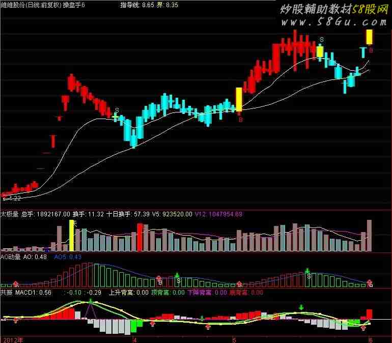 DIF:=(2*EMA(CLOSE, 12)-EMA(EMA(CLOSE,12),12))-(2*EMA(CLOSE, 26)-EMA(EMA(CLOSE, 26),26)); DEA:=2*EMA(DIF, 9) - EMA(EMA(DIF, 9),9); MACD1:3*(DIF-DEA)COLORSTICK; MACD2:=EMA(MACD1,3); STICKLINE(MACD1>MACD2 AND MACD1>0,0,MACD1,3,0),COLORRED; STICKLINE(MACD1>MACD2 AND MACD1<0,0,MACD1,3,0),COLORGREEN; STICKLINE(MACD1<MACD2,0,MACD1,3,0),COLORCBCBC0; STICKLINE(MACD1>=0 OR MACD1<=0,0,0,50,1),COLORWHITE; DIF,COLOR33FF33,LINETHICK2; DEA,COLORYELLOW,LINETHICK2; MACD:=MACD1,NODRAW,COLORMAGENTA; 强:=IF(DIF>=DEA,DIF,DRAWNULL),COLORRED,LINETHICK2; 弱:=IF(DEA>=DIF,DEA,DRAWNULL),COLORFF9900,LINETHICK2; DRAWICON(CROSS(DIF,DEA),DIF-0.2,1); DRAWICON(CROSS(DEA,DIF),DEA+0.2,2); A1:=BARSLAST(REF(CROSS("MACD.DIF","MACD.DEA"),1)); B1:=REF(C,A1+1)>C AND REF("MACD.DIF",A1+1)<"MACD.DIF" AND CROSS("MACD.DIF","MACD.DEA"); {DRAWTEXT(B1>0,-0.05,'MACD底背'),COLORFF00FF;} A2:=BARSLAST(REF(CROSS("KDJ.K","KDJ.D"),1)); B2:=REF(C,A2+1)>C AND REF("KDJ.K",A2+1)<"KDJ.K" AND CROSS("KDJ.K","KDJ.D"); {DRAWTEXT(B2,-0.08,'KDJ底离'),COLORYELLOW;}{KDJ底背离}; A3:=BARSLAST(REF(CROSS("RSI.RSI1","RSI.RSI2"),1)); B3:=REF(C,A3+1)>C AND REF("RSI.RSI1",A3+1)<"RSI.RSI1" AND CROSS("RSI.RSI1","RSI.RSI2"); {DRAWTEXT(B3>0,-0.1,'RSI底离'),COLORCYAN;}{RSI底背离}; C1:=BARSLAST(REF(CROSS("MACD.DEA","MACD.DIF"),1)); D1:=REF(C,C1+1)<C AND REF("MACD.DIF",C1+1)>"MACD.DIF" AND CROSS("MACD.DEA","MACD.DIF"); {DRAWTEXT(D1>0,0.05,'MACD顶离'),COLORBLUE;}{MACD顶背离} C2:=BARSLAST(REF(CROSS("KDJ.D","KDJ.K"),1)); D2:=REF(C,C2+1)<C AND REF("KDJ.K",C2+1)>"KDJ.K" AND CROSS("KDJ.D","KDJ.K"); {DRAWTEXT(D2>0,0.1,'KDJ顶离'),COLORLIGRAY;}{KDJ顶背离} C3:=BARSLAST(REF(CROSS("RSI.RSI2","RSI.RSI1"),1)); D3:=REF(C,C3+1)<C AND REF("RSI.RSI1",C3+1)>"RSI.RSI1" AND CROSS("RSI.RSI2","RSI.RSI1");{DRAWTEXT(D3>0,0.2,'RSI顶离'),COLORGREEN;}{RSI顶背离}; DD:=C=HHV(C,180); EE:=DEA< REF(DEA,1) AND REF(DEA< REF(DEA,1),1)=1; CC:=C> REF(C,1) AND REF(C> REF(C,1),1)=1; 上升背离:(CC AND EE)*DEA,COLOR00FFFF; 顶背离:(DD AND EE AND DEA< HHV(DEA,180))*DEA,STICK,LINETHICK3,COLORGREEN; FF:=C=LLV(C,180); GG:= DEA> REF(DEA,1) AND REF(DEA> REF(DEA,1),1)=1; LL:=C< REF(C,1) AND REF(C< REF(C,1),1)=1; 下降背离:(LL AND GG)*DEA,COLORMAGENTA; 底背离:(FF AND GG AND DEA> LLV(DEA,180))*DEA,STICK,LINETHICK3,COLORRED; |