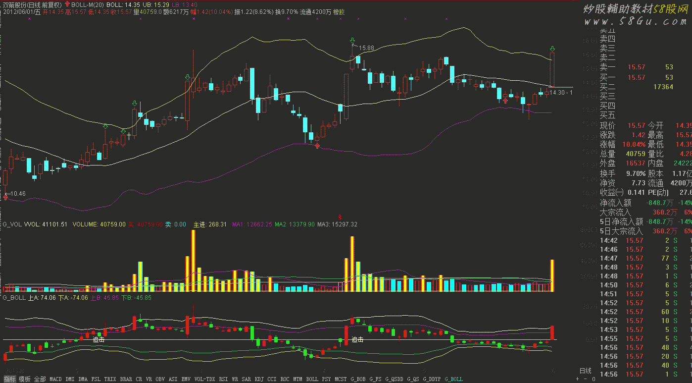MID:= MA(CLOSE,26); AB:= EMA((EMA(CLOSE,3)+EMA(CLOSE,5)+EMA(CLOSE,8)+EMA(CLOSE,13))/4,2)LINETHICK2; UPPER:= IF(DATE<1090501,MID+2*STD(CLOSE,26),0); AUPPER:= IF(DATE<1090501,MID+1.7*2*STD(CLOSE,26),0); LOWER:= IF(DATE<1090501,MID-2*STD(CLOSE,26),0); ALOWER:= IF(DATE<1090501,MID-1.7*2*STD(CLOSE,26),0); DRAWTEXT(CROSS(AB,MID),0,'追击'); |