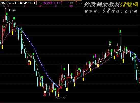 主图指标,线上买,线下卖,绝对收益,永不套牢。 VAR1:=CLOSE>REF(CLOSE,1) AND CLOSE>REF(CLOSE,2); VAR2:=REF(VAR1,1) AND CLOSE<=REF(CLOSE,1) AND CLOSE>=REF(CLOSE,2); VAR3:=REF(VAR2,1) AND CLOSE>=REF(CLOSE,1) AND CLOSE<=REF(CLOSE,2); VAR4:=REF(VAR3,1) AND CLOSE<=REF(CLOSE,1) AND CLOSE>=REF(CLOSE,2); VAR5:=REF(VAR4,1) AND CLOSE>=REF(CLOSE,1) AND CLOSE<=REF(CLOSE,2); VAR6:=REF(VAR5,1) AND CLOSE<=REF(CLOSE,1) AND CLOSE>=REF(CLOSE,2); VAR7:=REF(VAR6,1) AND CLOSE>=REF(CLOSE,1) AND CLOSE<=REF(CLOSE,2); VAR8:=REF(VAR7,1) AND CLOSE<=REF(CLOSE,1) AND CLOSE>=REF(CLOSE,2); VAR9:=REF(VAR8,1) AND CLOSE>=REF(CLOSE,1) AND CLOSE<=REF(CLOSE,2); VARA:=REF(VAR9,1) AND CLOSE<=REF(CLOSE,1) AND CLOSE>=REF(CLOSE,2); VARB:=REF(VARA,1) AND CLOSE>=REF(CLOSE,1) AND CLOSE<=REF(CLOSE,2); VARC:=REF(VARB,1) AND CLOSE<=REF(CLOSE,1) AND CLOSE>=REF(CLOSE,2); VARD:=CLOSE<REF(CLOSE,1) AND CLOSE<REF(CLOSE,2); VARE:=REF(VARD,1) AND CLOSE>=REF(CLOSE,1) AND CLOSE<=REF(CLOSE,2); VARF:=REF(VARE,1) AND CLOSE<=REF(CLOSE,1) AND CLOSE>=REF(CLOSE,2); VAR10:=REF(VARF,1) AND CLOSE>=REF(CLOSE,1) AND CLOSE<=REF(CLOSE,2); VAR11:=REF(VAR10,1) AND CLOSE<=REF(CLOSE,1) AND CLOSE>=REF(CLOSE,2); VAR12:=REF(VAR11,1) AND CLOSE>=REF(CLOSE,1) AND CLOSE<=REF(CLOSE,2); VAR13:=REF(VAR12,1) AND CLOSE<=REF(CLOSE,1) AND CLOSE>=REF(CLOSE,2); VAR14:=REF(VAR13,1) AND CLOSE>=REF(CLOSE,1) AND CLOSE<=REF(CLOSE,2); VAR15:=REF(VAR14,1) AND CLOSE<=REF(CLOSE,1) AND CLOSE>=REF(CLOSE,2); VAR16:=REF(VAR15,1) AND CLOSE>=REF(CLOSE,1) AND CLOSE<=REF(CLOSE,2); VAR17:=REF(VAR16,1) AND CLOSE<=REF(CLOSE,1) AND CLOSE>=REF(CLOSE,2); VAR18:=REF(VAR17,1) AND CLOSE>=REF(CLOSE,1) AND CLOSE<=REF(CLOSE,2); VAR19:=REF(VARD OR VARE OR VARF OR VAR10 OR VAR11 OR VAR12 OR VAR13 OR VAR14 OR VAR15 OR VAR16 OR VAR17 OR VAR18,1) AND VAR1; STICKLINE(VAR19,L,L*0.98,3,0),COLORYELLOW; VAR1A:=REF(VAR1 OR VAR2 OR VAR3 OR VAR4 OR VAR5 OR VAR6 OR VAR7 OR VAR8 OR VAR9 OR VARA OR VARB OR VARC,1) AND VARD; STICKLINE(VAR1A,H*1.01,H,3,0),COLOR00FF00{98FD}; XXMA:MA(C,5),COLORWHITE; DD5:=XXMA<REF(XXMA,1); IF(DD5,XXMA,DRAWNULL),COLOR00FF00; X:=(3*C+L+O+H)/6; 多空线:(20*X+19*REF(X,1)+18*REF(X,2)+17*REF(X,3)+16*REF(X,4)+15*REF(X,5)+14*REF(X,6) +13*REF(X,7)+12*REF(X,8)+11*REF(X,9)+10*REF(X,10)+9*REF(X,11)+8*REF(X,12) +7*REF(X,13)+6*REF(X,14)+5*REF(X,15)+4*REF(X,16)+3*REF(X,17)+2*REF(X,18)+ REF(X,20))/210,COLORFF00FF,LINETHICK1; {用法:黄托底买进,绿压顶买出。} DD:=多空线<REF(多空线,1); IF(DD,多空线,DRAWNULL),COLORBLUE,LINETHICK3; A:=(XXMA>多空线); IF(A,多空线,DRAWNULL),COLORYELLOW,POINTDOT; A1:=(XXMA<多空线); IF(A1,多空线,DRAWNULL),COLORWHITE; V1:=CLOSE*VOL; V2:=EMA(V1,13)/EMA(VOL,13); CYS:=(EMA((CLOSE-V2)/V2,1)*100); AA:=CYS; MIDD:=MA(CYS,20); CC:=MIDD+0.85*STD(CYS,10); TM6:=AA>CC; IF(TM6,XXMA,DRAWNULL),COLORRED,LINETHICK2;