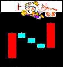 形态确立——在本形态中,主要应注意两点: 一是形态中间的三根小阴阳线。如果上升三法中的三根小阴阳线击穿了第一根长阳线的最低,形态即宣告失败。 二是第五根阴阳线的长度。原则上第五根越长越有效,收盘价最好是能创出新高。如果第五根阴阳线的收盘价不能突破第一根阳线的收盘价,则形态难以成立。 识别标准: 1、一根长阴阳线反映出当前的趋势。 2、在此阴阳线之后,出现一群实体短小的阴阳线。这群阴阳线最好颜色相反。 3、这群短小阴阳线呈逆势走势,而且位于第一天的高、低价范围内。 4、最后一天出现强劲的盘势,其方向则顺着原来的趋势,其收盘价则超越第一天的收盘价。 |