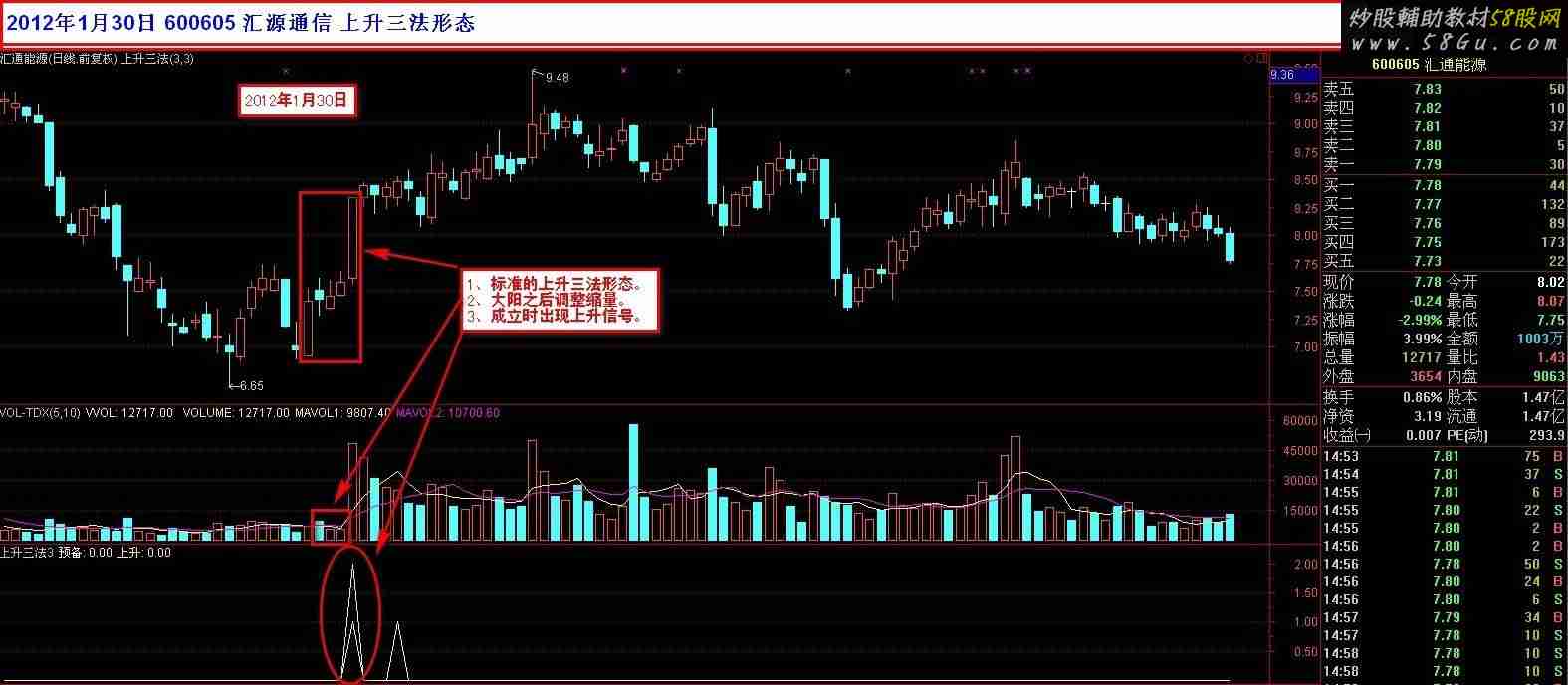 {一下文字来自网络} 上升三法概念:股价持续上涨中,某日出现一根大阳线,隔日後连续出现三根小阴线,被视为另一波上涨的信号。 上升三法:在上升趋势中,出现一根长阳线,在此长阳之后,出现一群实体短小的阴阳线,显示先前趋势所面临的一些压力。一般而言,这些盘整的线形大多为黑线,但最重要的一点是,这些线形的实体必须处在第一天长白线的高、低价范围内,包括影线在内。最后一根阴阳线(通常为第五天)的开盘价位于前一天收盘价之上,并且收盘价创出新高。