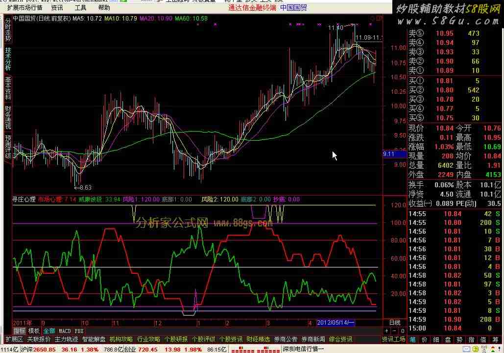 看到谦班威廉波段加市场心理感到不错,故而稍作变化而得之。 N:=14; 均价:=(2*C+(H-L)/2+L)/3; 价差:=SUM(均价-REF(均价,1),2)/2; 高低:=(均价+价差); 实价:=(高低+均价)/2; aa:=eMA(((SLOPE(实价,N)*20)+实价),N*3); bb:=eMA(((SLOPE(均价,N)*20)+均价),N*3); 多空线:=(AA+bb)/2; 市场心理:COUNT(C>多空线,n)/n*100,COLORRED,LINETHICK2; 威廉波段:(HHV(HIGH,63)-CLOSE)/(HHV(HIGH,63)-LLV(LOW,63))*100,COLOR00bb00,LINETHICK2; 风险1:IF(市场心理>95,市场心理+5,120),COLORMAGENTA,LINETHICK1; 底部1:IF(市场心理<5,市场心理-5,0),COLORGRAY,LINETHICK2; STICKLINE(C>0,80,80,5,0),COLORRED; STICKLINE(C>0,50,50,10,0),COLORWHITE; STICKLINE(C>0,20,20,5,0),COLORRED; 风险2:IF(威廉波段<5,100,120),COLOR00FFFF,LINETHICK1; 底部2:IF(威廉波段>99,20,0),COLORAAAA00,LINETHICK2; 抄底:IF(CROSS(市场心理,7),25,0),COLORMAGENTA; STICKLINE(C>0,99,99,5,0),COLORFF00FF; STICKLINE(C>0,5,5,5,0),COLORFF00FF;  |