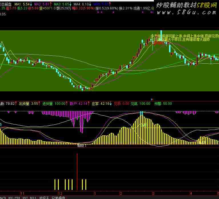 VAR11:=EMA(HHV(HIGH,500),21);VAR2:=EMA(HHV(HIGH,250),21);VAR3:=EMA(HHV(HIGH,90),21);VAR4:=EMA(LLV(LOW,500),21);VAR5:=EMA(LLV(LOW,250),21);VAR6:=EMA(LLV(LOW,90),21);VAR7:=EMA((VAR4*0.96+VAR5*0.96+VAR6*0.96+VAR11*0.558+VAR2*0.558+VAR3*0.558)/6,21);VAR8:=EMA((VAR4*1.25+VAR5*1.23+VAR6*1.2+VAR11*0.55+VAR2*0.55+VAR3*0.65)/6,21);VAR9:=EMA((VAR4*1.3+VAR5*1.3+VAR6*1.3+VAR11*0.68+VAR2*0.68+VAR3*0.68)/6,21);VARA:=EMA((VAR7*3+VAR8*2+VAR9)/6*1.738,21);VARB:=REF(LOW,1);VARC:=SMA(ABS(LOW-VARB),3,1)/SMA(MAX(LOW-VARB,0),3,1)*100;VARD:=EMA(IF(CLOSE*1.35<=VARA,VARC*10,VARC/10),3);VARE:=LLV(LOW,30);VARF:=HHV(VARD,30);VAR10:=IF(MA(CLOSE,58),1,0);AA3:=( EMA(IF(LOW<=VARE,(VARD+VARF*2)/2,0),3)/618*VAR10);BB:=AA3>REF(HHV(AA3,60),1);CC:=HHV(AA3,60);大底:=FILTER(AA3>10 ,1) ;预警:STICKLINE(大底>0 AND C{VA1:=VOL/((HIGH-LOW)*2-ABS(CLOSE-OPEN));主买1:=IF(CLOSE>OPEN,VA1*(HIGH-LOW),IF(CLOSE主卖1:=IF(CLOSE>OPEN,0-VA1*((HIGH-CLOSE)+(OPEN-LOW)),IF(CLOSEAA6:=(主买1-(-主卖1))/主买1;};{第二段 拉升}ZKK:="KD.K#WEEK"(9,3,3),COLORRED;ZKD:="KD.D#WEEK"(9,3,3),COLORYELLOW;KCD:=FILTER(CROSS(ZKK,ZKD) AND REF(ZKD,1)<30,13);XG1:=KCD;STICKLINE(XG1,80,10,1,0),COLOR000099;{第三段 旭日东升}VAR12:=(CLOSE-MA(CLOSE,50))/MA(CLOSE,50)*100<-23;VAR13:=SMA(MAX(CLOSE-REF(CLOSE,1),0),3,1)/SMA(ABS(CLOSE-REF(CLOSE,1)),3,1)*100>16;VAR14:=100*(HHV(HIGH,27)-CLOSE)/(HHV(HIGH,27)-LLV(LOW,27));XG2:=VAR12 AND VAR13 AND CROSS(VAR14,79) AND (OPEN>CLOSE OR OPENMA(VOL,23);旭日东升:STICKLINE(XG2,50,10,1,0),COLORFFFFFF; |