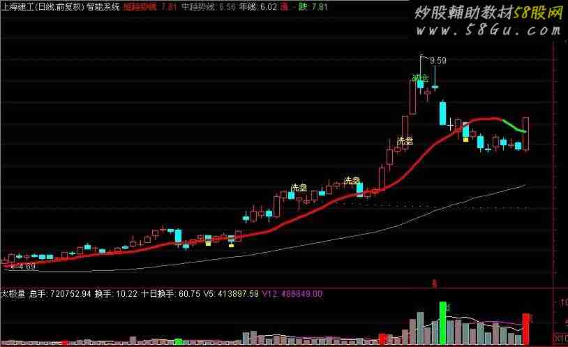 总手:VOL,VOLSTICK; 换手:VOL/CAPITAL*100,POINTDOT; 十日换手:SUM(换手,10); ZZ:=IF(REF(C,1)>REF(O,1) AND O>REF(C,1)*1.014 AND C<O*1.02,1,3); V5:MA(V,5),LINETHICK1; V12:MA(V,12),LINETHICK1; V34:=MA(V,34); C6:=MA(C,6); STICKLINE(C,0,VOL,2,0),COLORGRAY; STICKLINE(CROSS(C,C6) AND V>V5*1.2 AND V>V12*1.2 AND ZZ>2 AND C>H*0.975,0,VOL,2,0),COLORRED; STICKLINE(CROSS(C6,C) AND V>V5*1.2 AND V>V12*1.2,0,VOL,2,0),COLORGREEN; STICKLINE(VOL>MA(VOL,5)*2 AND V>V34*3 AND C<REF(C,1)*1.05,0,VOL,2,0),COLORYELLOW; STICKLINE(VOL<MA(VOL,5)/2 AND V<V12/2,0,VOL,2,0),COLORBLUE; STICKLINE(VOL>MA(VOL,5)*2 AND V>V34*3 AND C<REF(C,1)*1.05 AND CROSS(C,C6) AND V>V5*1.2 AND V>V12*1.2 AND ZZ>2 AND C>H*0.975,VOL*0.5,0,2,0),COLORRED; STICKLINE(VOL>MA(VOL,5)*2 AND V>V34*3 AND C<REF(C,1)*1.05 AND CROSS(C6,C) AND V>V5*1.2 AND V>V12*1.2,VOL*0.5,0,2,0),COLORWHITE; DRAWTEXT (VOL>MA(VOL,5)*2 AND V>V34*3 AND C<REF(C,1)*1.05,V,'天'),COLORYELLOW; DRAWTEXT (VOL<MA(VOL,5)/2 AND V<V12/2,(V5+V)/2,'地'),COLORBLUE; DRAWTEXT (CROSS(C,C6) AND V>V5*1.2 AND V>V12*1.2 AND ZZ>2 AND C>H*0.975,V,'吸'),COLORRED; DRAWTEXT (CROSS(C6,C) AND V>V5*1.2 AND V>V12*1.2,V,'出'),COLORGREEN;