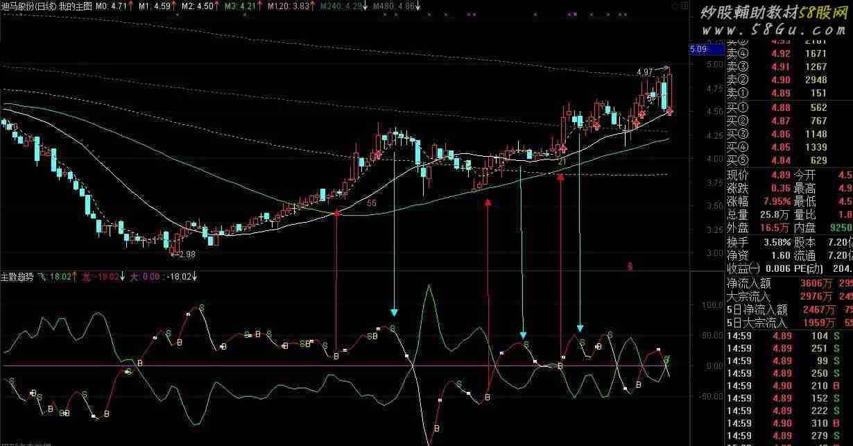 主力:=XMA(XMA((CLOSE*2+LOW-OPEN-HIGH)/4,2),2); 散户:=EMA(主力,11)-EMA(主力,22); 量比:=EMA(散户,5); 飞: (-100)*(散户-量比)*100,COLOR00FF00,LINETHICK1; 龙: 100*(散户-量比)*100,COLOR0000FF,LINETHICK1; 大:0; IF(龙<=REF(龙,1),龙,DRAWNULL),COLOR00FFFF,LINETHICK1; DRAWTEXT(CROSS(龙,REF(龙,1)),龙,'B'),COLOR00FFFF; DRAWTEXT(CROSS(REF(龙,1),龙),龙,'S'),COLOR00FF00; |