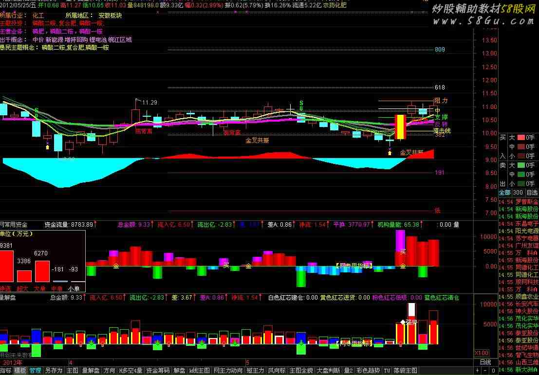主要使用方法:1 做33线以上的股票,买入点在5日均线双穿33线后回调在5日线附近是买点,其它提示在指标中有说明仅供参考,怕函数有未来的慎用。{N1:1,100,10;N2:1,100,10;DISP:=1,3,2}; 网1:=EXPMA(C,5),COLORYELLOW; 网12:EXPMA(C,12),COLORGRAY,LINETHICK3; 网2:=EXPMA(网1,2); 网3:=EXPMA(网2,2); 网33:EXPMA(CLOSE,33),COLORFF00FF,LINETHICK4; TJ1A:IF(网1>网2,网1,网2),COLORLICYAN; TJ2A:IF(网1>网3,网1,网3),COLORGREEN; TJ3A:网1,COLORYELLOW,LINETHICK2; {QS} 网A:=EXPMA(CLOSE,5),COLORWHITE;网B:=EXPMA(CLOSE,33),COLORFF00FF,LINETHICK3;IF(网B<REF(网B,1),网B,DRAWNULL),COLOR00FF00,LINETHICK3; IF(网B<REF(网A,1),网A,DRAWNULL),COLORWHITE,LINETHICK1; IF(网1<REF(网B,1),网A,DRAWNULL),COLORGREEN,LINETHICK1; 高:=REFDATE(HHV(H,180),DATE); 低:=REFDATE(LLV(L,180),DATE); H1:=高-(高-低)*0.191; H2:=高-(高-低)*0.382,COLORFF6198; H3:=高-(高-低)*0.5,COLORFFFFFF; H4:=高-(高-低)*0.618; H5:=高-(高-低)*0.809; STICKLINE(CURRBARSCOUNT=13,高,高,100,-1),COLORGREEN; STICKLINE(CURRBARSCOUNT=13,H1,H1,100,-1),COLORCYAN; STICKLINE(CURRBARSCOUNT=13,H2,H2,100,-1),COLORCCCCCC; DRAWTEXT(CURRBARSCOUNT=1,高,' 高'),COLORGREEN; DRAWTEXT(CURRBARSCOUNT=1,H1,' 809'),COLORCYAN; DRAWTEXT(CURRBARSCOUNT=1,H2,' 618'),COLORFFFFFF; DRAWTEXT(CURRBARSCOUNT=1,H3,' 中'),COLORYELLOW; DRAWTEXT(CURRBARSCOUNT=1,H4,' 382'),COLORLIRED; DRAWTEXT(CURRBARSCOUNT=1,H5,' 191'),COLORMAGENTA; DRAWTEXT(CURRBARSCOUNT=1,低,' 低'),COLORRED; STICKLINE(CURRBARSCOUNT=13,H3,H3,100,-1),COLORYELLOW; STICKLINE(CURRBARSCOUNT=13,H4,H4,100,-1),COLORLIRED; STICKLINE(CURRBARSCOUNT=13,H5,H5,100,-1),COLORMAGENTA; STICKLINE(CURRBARSCOUNT=13,低,低,100,-1),COLORRED; DRAWTEXT_FIX(1,0.00,0,0,'所属行业:')COLOR0080FF; DRAWTEXT_FIX(1,0.07,0,0,HYBLOCK)COLOR0080FF; DRAWTEXT_FIX(1,0.14,0,0,'所属地区:')COLOR00FFFF; DRAWTEXT_FIX(1,0.21,0,0,DYBLOCK)COLOR00FFFF; DRAWTEXT_FIX(1,0.00,0.04,0,'主题投资:')COLOR0000FF; DRAWTEXT_FIX(1,0.07,0.04,0,EXTERNSTR(0,1))COLOR0000FF; DRAWTEXT_FIX(1,0.00,0.08,0,'主营业务:')COLORFF00FF; DRAWTEXT_FIX(1,0.07,0.08,0,EXTERNSTR(0,2))COLORFF00FF; DRAWTEXT_FIX(1,0.00,0.12,0,'出千概念:')COLORFF88FF; DRAWTEXT_FIX(1,0.07,0.12,0,EXTERNSTR(0,3))COLORFF88FF; DRAWTEXT_FIX(1,0.00,0.16,0,'愚民主题概念:'),COLOR00FFFF; DRAWTEXT_FIX(1,0.09,0.16,0,EXTERNSTR(0,4)),COLOR00FFFF; FF:=EMA(CLOSE,3); MA15:=EMA(CLOSE,21); DRAWTEXT(CROSS(FF,MA15),(LOW * 0.99),'底背离'),COLOR0000FF; DIFF:=EMA(CLOSE,2) - EMA(CLOSE,60); DEA:=EMA(DIFF,8); DRAWTEXT(CROSS(DIFF,DEA) AND CROSS("KDJ.K"(9,3,3),"KDJ.D"(9,3,3)),L-0.45,'金叉共振'),COLOR0099FF; DMLJ:=HHV(H,120); E:=(H+L+O+2*C)/5; CRTP:=E+(H-L); CRZL:=2*E-L; CRZC:=2*E-H; CRFZ:=E-(H-L); CRXL:=(E+CRTP+CRZL+CRZC+CRFZ)/5; 高1:=CONST(CRTP),COLORRED; 阻:=CONST(CRZL),COLORC7C9FF; 支:=CONST(CRZC),COLOR7C9CFF; 反:=CONST(CRFZ),COLORDD00DD; 心理:=CONST(CRXL); 高压:=DRAWLINE(S>1&&CURRBARSCOUNT=5+1,高1,ISLASTBAR,高,1),COLOR0000FF; 阻力:DRAWLINE(S>1&&CURRBARSCOUNT=5+1,阻,ISLASTBAR,阻,1),COLOR0099FF; 支撑:DRAWLINE(S>1&&CURRBARSCOUNT=5+1,支,ISLASTBAR,支,1),COLORGREEN; 反转价:DRAWLINE(S>1&&CURRBARSCOUNT=5+1,反,ISLASTBAR,反,1),COLORDD00DD; 次日心理价:DRAWLINE(S>1&&CURRBARSCOUNT=5+1,心理,ISLASTBAR,心理,1),COLORFFFFFF; DRAWTEXT(ISLASTBAR,反,' 反 转'),LINETHICK1,COLORDD00DD; DRAWTEXT(ISLASTBAR,支,' 支 撑'),LINETHICK1,COLOR00FF00; DRAWTEXT(ISLASTBAR,阻,' 阻 力'),LINETHICK1,COLOR0099FF; DRAWTEXT(ISLASTBAR,高,' 高 压'),LINETHICK1,COLOR0000FF; T1:=CONST(LLVBARS(LOW,10)); T1HIGH:=CONST(REF(HIGH,T1)); CC:=CONST(CURRBARSCOUNT); T2:=CONST(BARSLAST(CURRBARSCOUNT>CC+T1 AND H>T1HIGH)); T2HIGH:=CONST(REF(HIGH,T2)); T3:=CONST(BARSLAST(CURRBARSCOUNT>CC+T2 AND HIGH>T2HIGH)); T3HIGH:=CONST(REF(HIGH,T3)); 猎击线:DRAWLINE(CURRBARSCOUNT=T3+1, T3HIGH, ISLASTBAR, T3HIGH, 1),COLOR00FFFF,LINETHICK1; DRAWTEXT(ISLASTBAR, T3HIGH, '猎击线')LINETHICK1,COLOR00FFFF;涨停:=IF(REF(C,1)*1.1-C<0.01 ,1,0); STICKLINE(涨停,OPEN,CLOSE,4,0),COLORRED; STICKLINE(涨停,OPEN,CLOSE,2.0,0),COLORYELLOW; STICKLINE(涨停,H,L,0,0),COLORYELLOW; X1:=(REFDATE(HHV(HIGH,60),DATE)-REFDATE(LLV(LOW,60),DATE))/50; X2:=REFDATE(LLV(LOW,60),DATE)+X1; DI:=EMA(C,12)-EMA(C,26); DE:=EMA(DI,9); M:=(DI-DE)*4+X2; DRAWBAND(M,RGB(255,0,0),X2,RGB(0,255,250));
