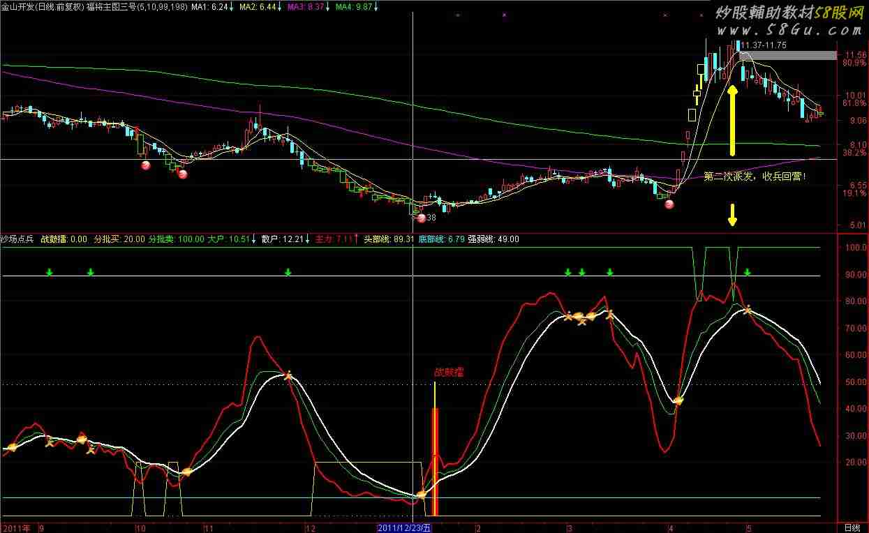 指标名称:沙场点兵(副图指标,无未来函数) 说明:买入条件:图面底部出现黄色建仓区,关注,一旦出现中红变黄柱状,买;红色主力线出现金色钻石符号,买!卖出条件:图面顶部出现绿色派发区,卖,红色主力线出现人形符号卖。特别注意:一旦红色主力线回调后重新上穿50强弱分界,且角度大,猛涨的可能性较大!{沙场点兵,福将牵牛优化} VAR1:=3*SMA((CLOSE-LLV(LOW,75))/(HHV(HIGH,75)-LLV(LOW,75))*100,20,1)-2*SMA(SMA((CLOSE-LLV(LOW,75))/(HHV(HIGH,75)-LLV(LOW,75))*100,20,1),15,1); VAR2:=(CLOSE-LLV(LOW,26))/(HHV(HIGH,26)-LLV(LOW,26))*100; VAR3:=SMA(SMA(VAR2,3,1),3,1); VAR4:=EMA(VAR3,5); VAR5:=LLV(LOW,26); VAR6:=HHV(HIGH,34); VAR7:=EMA((CLOSE-VAR5)/(VAR6-VAR5)*4,4)*25; VAR8:=100-VAR1; VAR9:=(CLOSE-LLV(LOW,9))/(HHV(HIGH,9)-LLV(LOW,9))*100; VAR10:=SMA(VAR9,3,1); VAR11:=SMA(VAR10,3,1); VAR12:=EMA(3*VAR10-2*VAR11,3); VAR13:=(-1)*(EMA(VAR8,1)-50)+50; VAR14:=EMA(100*(HHV(HIGH,14)-CLOSE)/(HHV(HIGH,14)-LLV(LOW,14)),6); STICKLINE((CROSS(VAR4,10) AND VAR4>10),40,0,5,0),COLORRED; 战鼓擂:IF(CROSS(VAR4,10) AND VAR4>10,50,0),STICK,COLORYELLOW,LINETHICK2; DRAWTEXT((CROSS(VAR4,10) AND VAR4>10),55,'战鼓擂'),COLORRED;分批买: IF((VAR7<10),20,0), LINETHICK1, COLOR00CCFF; 分批卖: IF((VAR7>90),80,100), LINETHICK1 ,COLORGREEN; 大户:SMA((C-LLV(L,27))/(HHV(H,27)-LLV(L,27))*100,9,1),COLOR00FF00; 散户:SMA(大户,3,1), LINETHICK2 , COLORWHITE; 主力:3*大户-2*散户, LINETHICK2 , COLORRED; 头部线:89.307; 底部线:6.788,COLORFFFF00; 强弱线:49, COLORWHITE,POINTDOT,LINETHICK2;DRAWICON(CROSS(散户,主力),主力,15); DRAWICON(CROSS(散户,主力),90,2); DRAWICON(CROSS(主力,散户),散户,26);