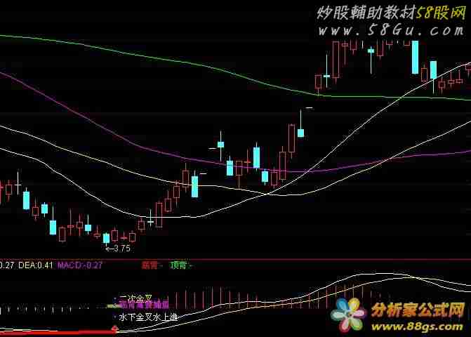DIFF:EMA(CLOSE,12)-EMA(CLOSE,27); DEA:EMA(DIFF,9); MACD:2*(DIFF-DEA), COLORSTICK,LINETHICK2; 水下金叉:=CROSS(DIFF,DEA) AND DIFF<0; STICKLINE(水下金叉,0,0.08,6,0),COLORYELLOW; DRAWTEXT(水下金叉,-0.2,' 水下金叉水上渔'),COLORWHITE; 水上金叉:=CROSS(DIFF,DEA) AND DIFF>0; STICKLINE(水上金叉,0,0.08,6,0),COLORYELLOW; DRAWTEXT(水上金叉,0.15,' 水上金叉鱼満仓'),COLORWHITE; 金叉爬坡:=CROSS(DIFF,DEA) AND DIFF>=-0.1 AND DIFF<0.1; STICKLINE(金叉爬坡,0,0.08,6,0),COLORYELLOW; DRAWTEXT(金叉爬坡,0.22,'金叉爬坡金満钵'),COLORWHITE; JCCOUNT:=COUNT(CROSS(DIFF,DEA),BARSLAST(DEA>=0)); 二次金叉:=CROSS(DIFF,DEA) AND COUNT(JCCOUNT>=2,10)=1; STICKLINE(二次金叉,0,0.06,6,0),COLORFF00FF; DRAWICON(二次金叉,DEA*0.9,1) ; DRAWTEXT(二次金叉,0.25,' 二次金叉'),COLORYELLOW; A1:=BARSLAST(REF(CROSS(DIFF,DEA),1)); 底背离:=REF(CLOSE,A1+1)>CLOSE AND DIFF>REF(DIFF,A1+1) AND CROSS(DIFF,DEA); STICKLINE(底背离,0,0.03,6,0),COLOR00FF00; 底背:DRAWLINE(A1=0,DEA,底背离,DEA,0),COLORRED,LINETHICK4; DRAWTEXT(底背离,0.10,' 底背离要捕鱼'),COLORFF00FF; A2:=BARSLAST(REF(CROSS(DEA,DIFF),1)); 顶背离:=REF(CLOSE,A2+1)<CLOSE AND REF(DIFF,A2+1)>DIFF AND CROSS(DEA,DIFF); 顶背:DRAWLINE(A2=0,DEA,顶背离,DEA,0),COLORGREEN,LINETHICK4;