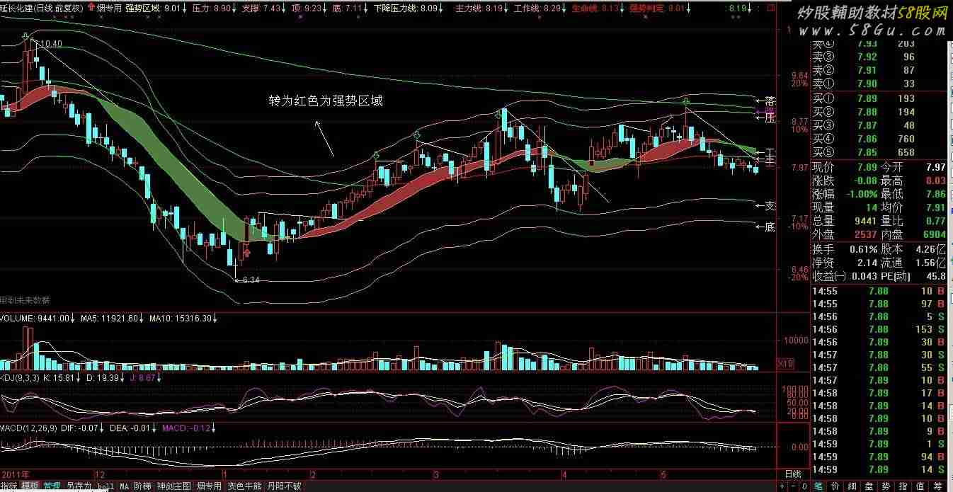 强势区域:EMA(C,250),COLORYELLOW,DOTLINE; AA:=ABS((2*CLOSE+HIGH+LOW)/4-MA(CLOSE,30))/MA(CLOSE,30); JAX:=DMA((2*CLOSE+LOW+HIGH)/4,AA); 压力:(1+9/100)*JAX,COLORLIRED; 支撑:(1-9/100)*JAX,COLORLIRED; 顶:(1+13/100)*JAX,COLORLIRED; 底:(1-13/100)*JAX,COLORLIRED; 下降压力线:DRAWLINE(HIGH>=HHV(HIGH,10),HIGH,LOW<=LLV(LOW,3),HHV(HIGH,3),1),COLORYELLOW; DRAWBAND(MA(C,13),RGB(155,50,50),MA(C,21),RGB(83,123,68)); DRAWKLINE(H,O,L,C); 主力线:MA(C,13),COLORLIRED; 工作线:MA(C,21),COLORLIRED; 生命线:EMA(CLOSE,60),COLORRED, LINETHICK1; 强势判定:EMA(C,250),COLORRED,DOTLINE; ELE:=(((REF(HIGH,1))+(REF(LOW,1))+(REF(OPEN,1))+2*(REF(CLOSE,1)))/5); 突破价:=(ELE+((REF(HIGH,1))-(REF(LOW,1)))),NODRAW; 阻力价:=(2*ELE-(REF(LOW,1))),NODRAW; DRAWTEXT(ISLASTBAR,强势判定,'←强势判定'),COLORFFCC10,COLORMAGENTA; DRAWTEXT(ISLASTBAR,生命线,'←生命线'),COLORFFCC10,COLORMAGENTA; DRAWTEXT(ISLASTBAR,压力,'←压力'),COLORFFCC10,COLORYELLOW; DRAWTEXT(ISLASTBAR,支撑,'←支撑'),COLORFFCC10,COLORYELLOW; DRAWTEXT(ISLASTBAR,顶,'←落袋为安'),COLORFFCC10,COLORYELLOW; DRAWTEXT(ISLASTBAR,底,'←底.短线机会'),COLORFFCC10,COLORYELLOW; DRAWTEXT(ISLASTBAR,主力线,'←主力线'),COLORFFCC10,COLORYELLOW; DRAWTEXT(ISLASTBAR,工作线,'←工作线'),COLORFFCC10,COLORYELLOW; IF(主力线<=REF(主力线,1),主力线,DRAWNULL),COLORGREEN; IF(工作线<=REF(工作线,1),工作线,DRAWNULL),COLORGREEN; IF(压力<=REF(压力,1),压力,DRAWNULL),COLORGREEN; IF(支撑<=REF(支撑,1),支撑,DRAWNULL),COLORGREEN; IF(顶<=REF(顶,1),顶,DRAWNULL),COLORGREEN; IF(底<=REF(底,1),底,DRAWNULL),COLORGREEN; IF(生命线<=REF(生命线,1),生命线,DRAWNULL),COLORGREEN; IF(强势判定<=REF(强势判定,1),强势判定,DRAWNULL),COLORGREEN; |