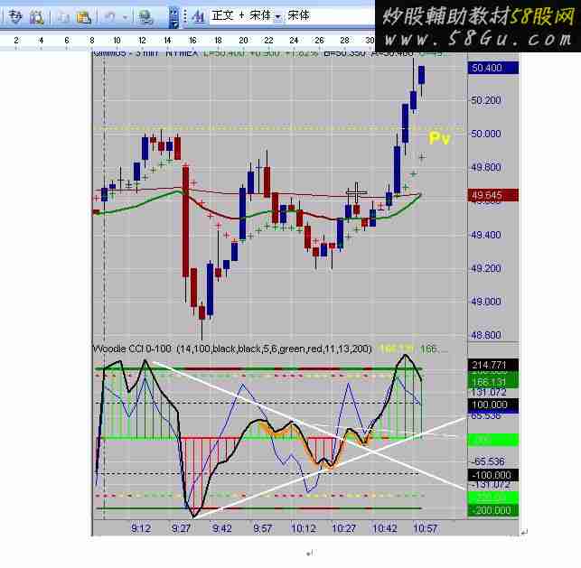 TYP:=(HIGH+LOW+CLOSE)/3; A1:(TYP-MA(TYP,14))/(0.015*AVEDEV(TYP,14)),COLORSTICK; A2:=(TYP-MA(TYP,7))/(0.015*AVEDEV(TYP,7)); STICKLINE(C,200,200,3,1),COLORLIGREEN; STICKLINE(C,-200,-200,3,1),COLORLIGREEN; STICKLINE(A2>A1,200,200,3,1),COLORLICYAN; CCI1:A1,COLORGRAY; CCI2:A2,COLORBLUE; 100,COLORYELLOW,POINTDOT; -100,COLORYELLOW,POINTDOT;