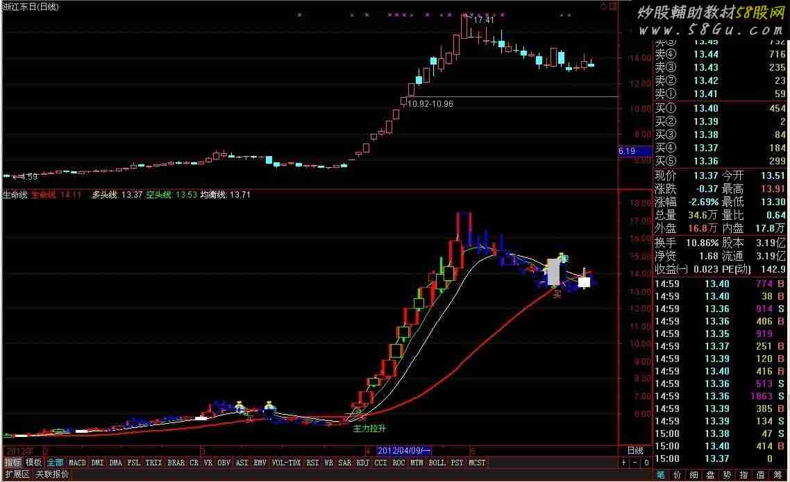 生命线:MA(CLOSE,26),COLORRED,LINETHICK2;STICKLINE(C>=生命线 AND C>=O,C,O,7,0),COLORRED;STICKLINE(C>=生命线 AND C>=O,H,L,0,0),COLORRED;DP:=IF(C=INDEXC,0,1);GJ:=AMOUNT/V/100 ; 多头线:EMA(C,1.5),COLORYELLOW;空头线:EMA(C,5),COLOR00FF00; 均衡线:EMA(空头线,5),COLORWHITE;VARF1:=COUNT(CROSS(多头线,均衡线),2)=1; VARF2:=COUNT(CROSS(空头线,均衡线),2)=1;ZAI:=FILTER(VARF1 AND VARF2,2); DRAWTEXT(ZAI,均衡线*0.98,' 主力拉升'),COLOR00FF00; MTM:=CLOSE-REF(CLOSE,1);DX:=100*EMA(EMA(MTM,6),6)/EMA(EMA(ABS(MTM),6),6); DY:=HHV(DX,2)=HHV(DX,7) AND COUNT(DX>50,2) AND CROSS(MA(DX,2),DX); LC:=REF(CLOSE,1);RSI:=SMA(MAX(CLOSE-LC,0),6,1)/SMA(ABS(CLOSE-LC),6,1)*100; ZDF:=(C-REF(C,1))/REF(C,1)*100; STICKLINE(ZDF>9.8,O,C,6,0),COLORRED;STICKLINE(ZDF<-9.8,O,C,6,0),COLORBLUE; VAR1:=(100 - ((90 * (HHV(HIGH,21) - CLOSE)) / (HHV(HIGH,21) - LLV(LOW,21)))); VAR2:=(100 - ((90 * (HHV(HIGH,21) - CLOSE)) / (HHV(HIGH,21) - LLV(LOW,21)))); VAR3:=(100 - MA(((100 * (HHV(HIGH,6) - CLOSE)) / (HHV(HIGH,6) - LLV(LOW,6))),34)); DRAWICON(CROSS(VAR2,MA(VAR3,6)),(LOW * 0.998),8); DRAWICON(CROSS(MA(VAR3,6),VAR1),(HIGH * 1.013),9);DRAWTEXT(CROSS(VAR2,MA (VAR3,6)),(LOW * 0.984),'买 '),COLOR4440FF;DRAWTEXT(CROSS(MA(VAR3,6),VAR1),(HIGH * 1.035),'卖 '),COLORFFFF34; VARE1:=EMA(C,3);VARE2:=EMA(C,5);VARE3:=EMA(C,10);VAR4:=EMA(C,20);VAR5:=EMA(C,30);VAR6:=(VAR2+VAR3+VAR4+VAR5)/4;VAR7:=(VAR6-REF(VAR6,15))/REF(VAR6,15)*100; VAR8:=(VAR6-REF(VAR6,15))/REF(VAR6, 15)*100;VAR9:=EMA(VAR7,8);STICKLINE(VAR7<1*REF(VAR7,1),H,L,0.5,0),COLORBLUE;STICKLINE(VAR7<1*REF(VAR7,1),O,C,5,1),COLORBLUE;STICKLINE (VAR7>1*REF(VAR7,1),H,L,0.5,0),COLORRED;STICKLINE(VAR7>1*REF(VAR7,1),O,C,5,1),COLORRED;STICKLINE(VAR7<1*REF(VAR7,1) AND VAR9>1*REF(VAR9,1),H,L,0.5,0),COLORGREEN; STICKLINE(VAR7<1*REF(VAR7,1) AND VAR9>1*REF(VAR9,1),O,C,5,1),COLORGREEN;买进价:=((C-REF(MA(C,6),1))/6+MA(C,6))*1.004; 买进条件:=CROSS(C,买进价) AND 买进价>REF(买进价,1);STICKLINE(买进条件,H,L,0.5,1),COLORWHITE,LINETHICK2; STICKLINE(买进条件,O,C,6,0),COLORWHITE,LINETHICK2; 加码价:=((C-REF(MA(C,18),1))/18+MA(C,18))*1.004;加码条件:=CROSS(C,加码价) AND 加码价>REF(加码价,1);STICKLINE(加码条件,H,L,0.5,1),COLORYELLOW,LINETHICK2; STICKLINE(加码条件,O,C,6,0),COLORYELLOW,LINETHICK;