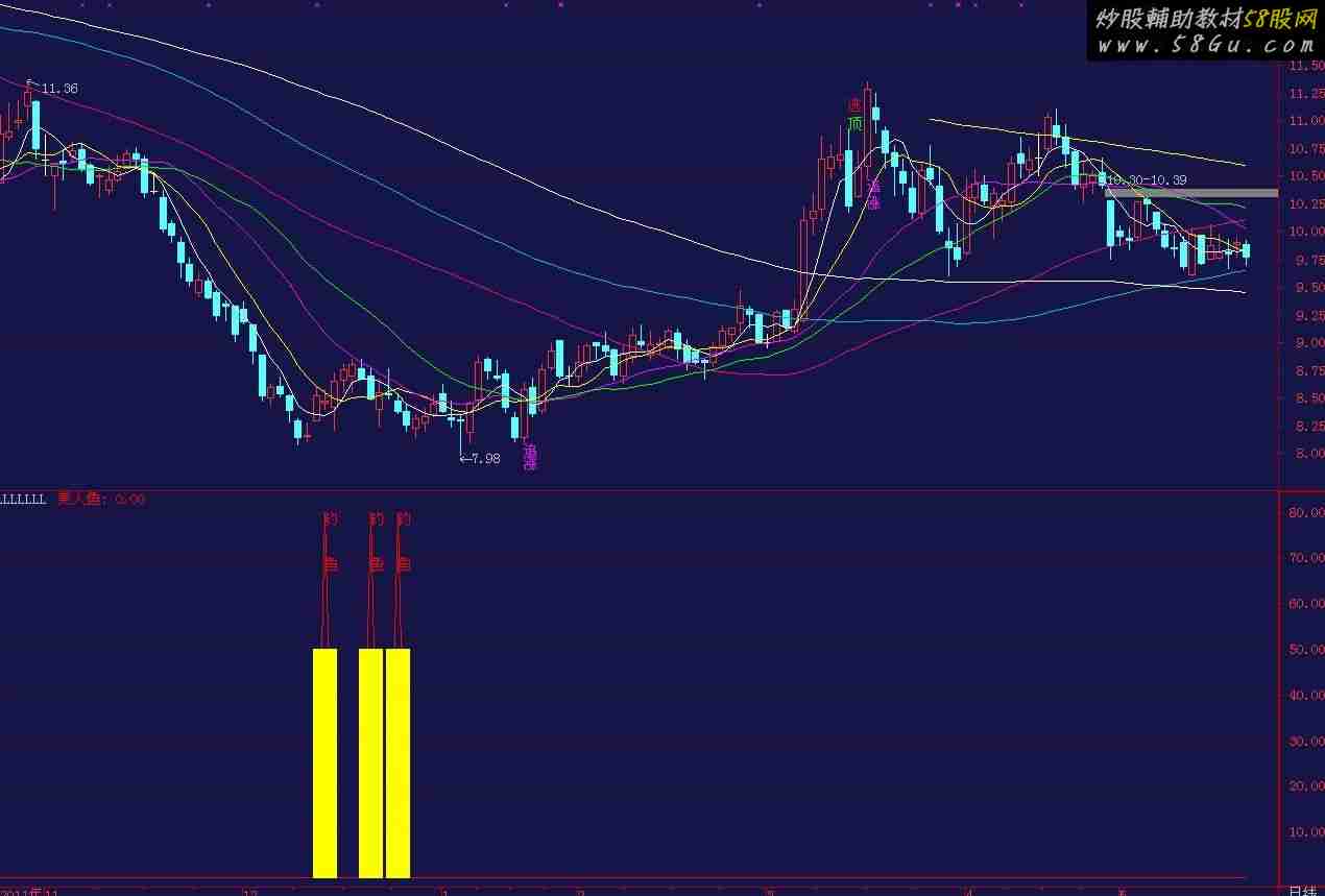 RSV:=(CLOSE-LLV(LOW,18))/(HHV(HIGH,18)-LLV(LOW,18))*100; K:=SMA(RSV,9,1); D:=SMA(K,3,1); 趋势J1:=3*K-2*D,COLORRED; 趋势J2:=EMA(K,3),LINETHICK1; BBIAS :=(CLOSE-MA(CLOSE,24))/MA(CLOSE,24)*100; 反弹:= IF(CROSS(K,D) AND BBIAS<-6 AND D<16 AND CLOSE>REF(CLOSE,1),80,0),COLOR00FF00; DRAWICON(反弹=80,趋势J2-0.005,1); 阶段底:=EMA(IF(L<= LLV(L,40),SMA(ABS(L-REF(L,1)),40,1)/SMA(MAX(L-REF(L,1),0),40,1),0),3)*10,STICK,COLORRED,LINETHICK2; V1:=AMOUNT/VOL/100; V2:=(3*HIGH+LOW+OPEN+2*CLOSE)/7; V3:=SUM(AMOUNT,7)/V1/100; V4:=DMA(V2,VOL/V3); V5:=(CLOSE-V4)/V4*100; V6:=MA(V5,20)+STD(V5,20); BIAS21:=(CLOSE-MA(CLOSE,21))/MA(CLOSE,21)*100; 水面:=20; 买人:=IF(趋势J1<30,趋势J1,DRAWNULL),COLORGREEN,LINETHICK5; 买人2:=CROSS(买人,趋势J2); 美人鱼:IF(买人2>0.5,80,0)COLORRED; DRAWTEXT(买人2,80,'钓')COLORRED; DRAWTEXT(买人2,70,'鱼')COLORRED; STICKLINE(买人2,50,0,10,0); |