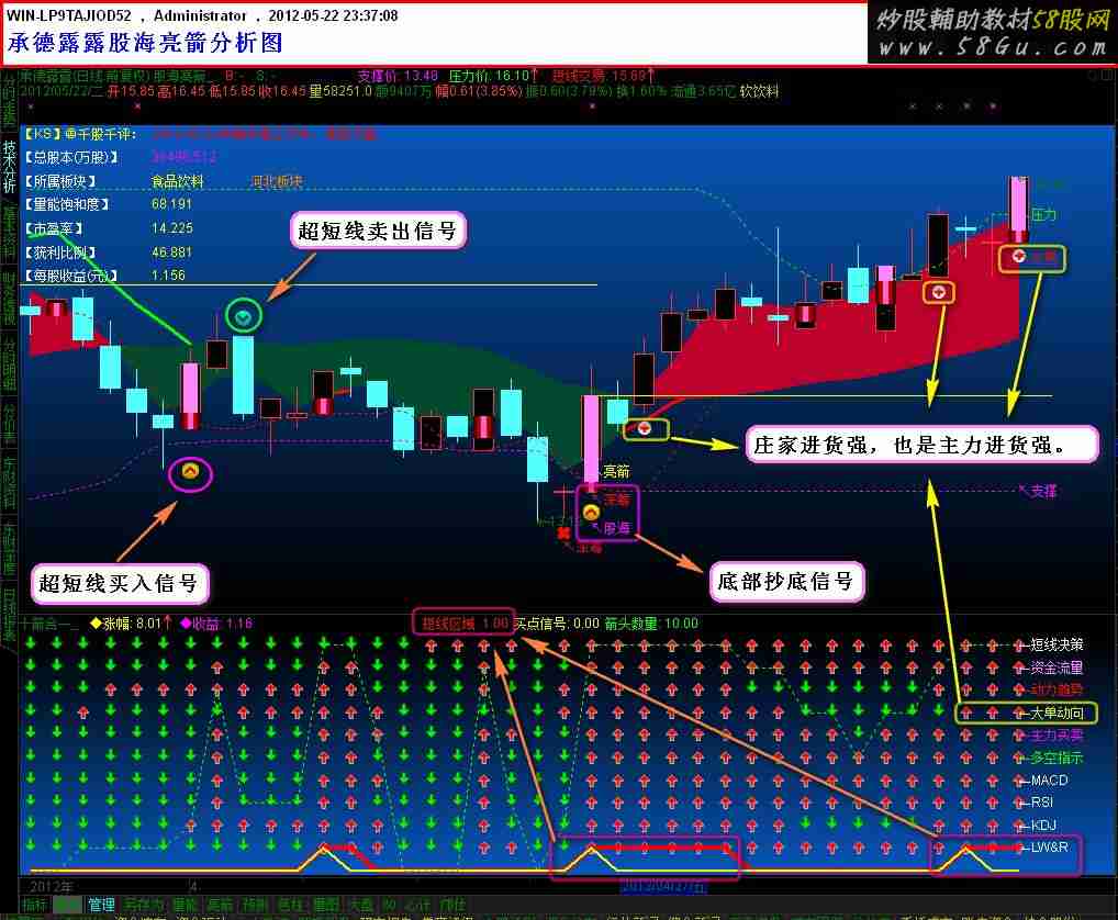 {海海深筹,亮箭必胜!} DRAWGBK(OPEN>0,RGB(8,88,188),RGB(0,0,0),0,'02',0); VAR3:=LLV(HIGH,240); VAR4:=100*(CLOSE-VAR3)/VAR3; VAR5:=(CLOSE-LLV(LOW,528))/(HHV(HIGH,528)-LLV(LOW,528))*100; VAR6:=(CLOSE-LLV(CLOSE,530))/(HHV(CLOSE,530)-LLV(CLOSE,530))*100; VAR7:=0; VAR8:=SMA(MAX(CLOSE-REF(CLOSE,1),0),34,1)/SMA(ABS(CLOSE-REF(CLOSE,1)),7,1)*100; VAR9:=SMA(MAX(CLOSE-REF(CLOSE,1),0),13,1)/SMA(ABS(CLOSE-REF(CLOSE,1)),13,1)*100; VAR10:=IF(TROUGHBARS(3,16,1)=0 AND HIGH>LOW+0.04,4,0); VAR11:=ZIG(3,6)>REF(ZIG(3,6),1) AND REF(ZIG(3,6),1)<=REF(ZIG(3,6),2) AND REF(ZIG(3,6),2)<=REF(ZIG(3,6),3); VAR12:=ZIG(3,6)<REF(ZIG(3,6),1) AND REF(ZIG(3,6),1)>=REF(ZIG(3,6),2) AND REF(ZIG(3,6),2)>=REF(ZIG(3,6),3); VAR13:=ZIG(3,22)>REF(ZIG(3,22),1) AND REF(ZIG(3,22),1)<=REF(ZIG(3,22),2) AND REF(ZIG(3,22),2)<=REF(ZIG(3,22),3); VAR14:=ZIG(3,22)<REF(ZIG(3,22),1) AND REF(ZIG(3,22),1)>=REF(ZIG(3,22),2) AND REF(ZIG(3,22),2)>=REF(ZIG(3,22),3); VAR15:=ZIG(3,51)>REF(ZIG(3,51),1) AND REF(ZIG(3,51),1)<=REF(ZIG(3,51),2) AND REF(ZIG(3,51),2)<=REF(ZIG(3,51),3); VAR16:=ZIG(3,51)<REF(ZIG(3,51),1) AND REF(ZIG(3,51),1)>=REF(ZIG(3,51),2) AND REF(ZIG(3,51),2)>=REF(ZIG(3,51),3); VAR17:=ZIG(3,72)>REF(ZIG(3,72),1) AND REF(ZIG(3,72),1)<=REF(ZIG(3,72),2) AND REF(ZIG(3,72),2)<=REF(ZIG(3,72),3); VAR18:=ZIG(3,72)<REF(ZIG(3,72),1) AND REF(ZIG(3,72),1)>=REF(ZIG(3,72),2) AND REF(ZIG(3,72),2)>=REF(ZIG(3,72),3); VAR19:=EMA(CLOSE,2)-EMA(CLOSE,150); 买1:=VAR10; 买2:=(VAR11+VAR13+VAR15+VAR17); 卖1:=(VAR12+VAR14+VAR16+VAR18); B:IF(买1>0 OR 买2>0,LOW*0.99,DRAWNULL),CROSSDOT,LINETHICK5,COLOR0800FF; DRAWTEXT(买1>0 OR 买2>0,LOW*0.98,'↖深筹'),COLORRED; S:IF(卖1>0,HIGH*1.03,DRAWNULL),CROSSDOT,LINETHICK5,COLOR008800; DRAWTEXT(卖1>0,HIGH*1.03,'↙卖出'),COLORGREEN; DRAWICON((ZIG(3,5)>REF(ZIG(3,5),1)) AND (REF(ZIG(3,5),1)<=REF(ZIG(3,5),2)) AND (REF(ZIG(3,5),2)<=REF(ZIG(3,5),3)),LOW*0.97,34) ; DRAWICON((ZIG(3,5)<REF(ZIG(3,5),1)) AND (REF(ZIG(3,5),1)>=REF(ZIG(3,5),2)) AND (REF(ZIG(3,5),2)>=REF(ZIG(3,5),3)),HIGH*1.01,35); ZB:=EMA(EMA(VAR3,5),5)*3, COLORSTICK; VARA:=IF(VAR9 AND CROSS(MA(CLOSE,3),MA(CLOSE,5)),20,0); K:=EMA(VAR7,5)*2, , COLORFF00FF; D:=EMA(K,5), , COLORWHITE; J:=K*3-D*2, ,COLORYELLOW; VARB:=BETWEEN(CLOSE,MA(CLOSE,3),MA(CLOSE,5)) AND J>10; HS:=VOL/CAPITAL*100, , COLORGREEN; VARE:=MA(100*(CLOSE-LLV(CLOSE,34))/(HHV(HIGH,34)-LLV(LOW,34)),5)-20; VARF:=100-3*SMA((CLOSE-LLV(LOW,75))/(HHV(HIGH,75)-LLV(LOW,75))*100,20,1)+2*SMA(SMA((CLOSE-LLV(LOW,75))/(HHV(HIGH,75)-LLV(LOW,75))*100,20,1),15,1); DRAWTEXT(VAR11 AND COUNT(VAR11,30)=1,LOW*0.96,'↖股海'),LINETHICK1,COLORFF00FF; VAR1A:=IF(VARE>0,VARE,0); VAR1B:=IF(VAR14>=200 AND VAR13>=150,15,IF(VAR14<=-200 AND VAR13<=-150,-15,VAR16))+60; VAR1C:=VAR1A>48 AND VAR1B>60 AND VAR19<100; DRAWTEXT(VAR1C AND COUNT(VAR1C,30)=1,LOW*0.95,'关注') COLORWHITE; N:=IF(BARSCOUNT(C)>=8,8,BARSCOUNT(C)); AMOV:=VOL*(C+L+H)/3; MN:=SUM(AMOV,N)/SUM(VOL,N); NOTEXT1:IF(C>=MN,MN,DRAWNULL),LINETHICK3,COLORRED; NOTEXT2:IF(C<MN,MN,DRAWNULL),LINETHICK3,COLORGREEN; DRAWBAND(MA(CLOSE,3),RGB(188,0,43),MA(CLOSE,24),RGB(0,72,46)); QQ2:=(CLOSE-LLV(LOW, 18))/(HHV(HIGH, 18)-LLV(LOW, 18))*100; QQ3:=SMA(QQ2, 9, 1); QQ4:=SMA(QQ3, 3, 1); 长趋势:=3*QQ3-2*QQ4,COLORWHITE,LINETHICK3; 趋势线:=EMA(QQ3, 3),COLORRED,LINETHICK3; 金叉:= CROSS(长趋势,趋势线); AAAA1:=AMOUNT/V; BBB1:=L<AAAA1*0.9; CCC1:=(C-REF(C,1))/REF(C,1)*100>1.2; DDD1:=L<MA(C,5)*0.921; EEE1:=V<MA(V,5)*1.5; 老鼠仓:=BBB1 AND CCC1 AND DDD1 AND EEE1,,NODRAW; DRAWICON(老鼠仓 OR 金叉,(LOW - (LOW * 0.01)),9);AA05:=MA(C,5),COLOR0099CC; BB05:=ATAN((AA05/REF(AA05,1)-1)*100)*180/3.1416; 速度5:=SMA(EMA((AA05-REF(AA05,1))/REF(AA05,1),3)*100,3,1); 加速度5:=EMA((速度5-REF(速度5,1)),3),NODRAW; AA10:=MA(C,10); AA20:=MA(C,20);BB10:=ATAN((AA10/REF(AA10,1)-1)*100)*180/3.1416; AA30:=MA(C,30); 三拾日乖离率:=(C-AA30)/AA30*100; 加仓:=FILTER(COUNT(CROSS(BB05,30),5)>=1 AND AA05>REF(AA05,1) AND 三拾日乖离率>REF(三拾日乖离率,1) AND AA10>REF(AA10,1) AND 加速度5>REF(加速度5,1) AND 速度5>REF(速度5,1) ,10) ; DRAWICON(加仓,L*0.99,23); DRAWKLINE(H,O,L,C); TJ:=VOL>=REF(V,1)*1.91 AND C>REF(C,1)*1.01; DRAWTEXT(TJ,L,'↖亮箭'),COLORYELLOW; STICKLINE(TJ,OPEN,CLOSE,1.5,0),COLORYELLOW; K1:=SUMBARS(TJ,1); STICKLINE(K1,REF(C,K1-1),REF(C,K1-1),10,0),COLORYELLOW;MA30:=MA(C,30); 支撑价:MA(REF(LLV(C,30),1),2),DOTLINE,COLORFF00FF; DRAWTEXT(ISLASTBAR,支撑价,'↖支撑'),COLORFF00FF; 压力价:MA(REF(HHV(C,30),1),2),DOTLINE,COLORGREEN; DRAWTEXT(ISLASTBAR,压力价,'↖压力'),COLORGREEN; 短线交易:MA(REF(LLV(C,3),1),2),DOTLINE,COLORRED; DRAWTEXT(ISLASTBAR,短线交易,'↖交易'),COLORRED;B1:=REF(CLOSE,1); B2:=REF(CLOSE,2); B3:=REF(CLOSE,3); B4:=REF(CLOSE,4); CMAX:=MAX(MAX(MAX(CLOSE,B1),B2),B3); CMIN:=MIN(MIN(MIN(CLOSE,B1),B2),B3); 持股:=(CLOSE=CMAX AND (B1>=B2 OR B1>=B3)) OR ((B1=CMAX AND (B2=CMIN OR B3=CMIN)) AND CLOSE>=B2) OR (B2=CMAX AND B3=CMIN AND CLOSE>=B1) OR (B3=CMAX AND CLOSE>=B1 AND CLOSE>=B2); 变盘:=CLOSE=CMAX AND B1=CMIN; STICKLINE(变盘,B2,CLOSE,2,0),COLORFF88FF; 下跌:=(CLOSE=CMIN AND (B1<B2 OR B1<B3)) OR ((B1=CMIN AND (B2=CMAX OR B3=CMAX)) AND CLOSE<B2) OR (B2=CMIN AND B3=CMAX AND CLOSE<B1) OR (B3=CMIN AND CLOSE<B1 AND CLOSE<B2); 买入:=(B1=CMIN AND CLOSE>=B2) OR ((B2=CMIN AND B1<=B3) OR (B3=CMIN AND B1<=B2) AND B2<B4 AND CLOSE>=B1); STICKLINE(买入,B1,B2,3.0,0),COLOR000033; STICKLINE(买入,B1,B2,2.5,0),COLOR000055; STICKLINE(买入,B1,B2,2.0,0),COLOR000077; STICKLINE(买入,B1,B2,1.5,0),COLOR0000BB; STICKLINE(买入,B1,B2,1.0,0),COLOR0000DD; STICKLINE(买入,B1,B2,0.5,0),COLORCC66FF; DRAWTEXT(HIGH>=REF(CLOSE,1)*1.095,H*1.02,'←涨停'),COLORMAGENTA; STICKLINE(V/REF(V,1)>2,OPEN,CLOSE,1,0),COLOR00FFFF; DRAWTEXT(REF(CLOSE,1)>=LOW*1.095,LOW,'←跌停'),COLORGREEN;DRAWTEXT_FIX(1,0,0,0,'【KS】㊣千股千评:'),COLORYELLOW; DRAWTEXT_FIX(C>0,0.12,0,0,EXTERNSTR(0,1)),COLORRED,LINETHICK2; DRAWTEXT_FIX(1,0,0.05,0,'【总股本(万股)】'),COLORWHITE; DRAWNUMBER_FIX(1,0.12,0.05,0,CONST(FINANCE(1)/10000)),COLORMAGENTA; DRAWTEXT_FIX(1,0,0