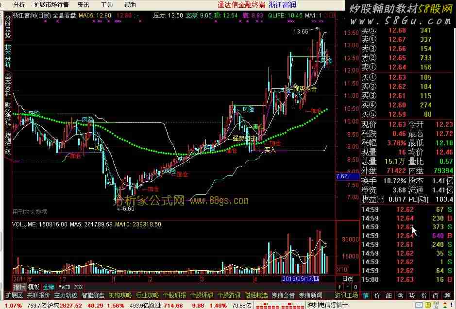 MA05:MA(C,5)LINETHICK2,COLOR00CCFF; MA10:=MA(C,10); MA30:=MA(C,30); 五日乖离率:=(C-MA05)/MA05*100; BB05:=ATAN((MA05/REF(MA05,1)-1)*100)*180/3.1416; 速度5:=SMA(EMA((MA05-REF(MA05,1))/REF(MA05,1),3)*100,3,1); 加速度5:=EMA((速度5-REF(速度5,1)),3),NODRAW; IF(BB05>30 AND MA05>REF(MA05,1), MA05,DRAWNULL),LINETHICK2,COLORRED; BB10:=ATAN((MA10/REF(MA10,1)-1)*100)*180/3.1416; IF(BB05<0 AND MA05<REF(MA05,1), MA05,DRAWNULL),LINETHICK2,COLORGREEN; 三拾日乖离率:=(C-MA30)/MA30*100,NODRAW; BB30:=ATAN((MA30/REF(MA30,1)-1)*100)*180/3.1416; 强势狙击:=FILTER(BB30>30 AND BB10>45 AND CROSS(BB05,60),10); 加仓:=FILTER(COUNT(CROSS(BB05,30),5)>=1 AND MA05>REF(MA05,1) AND 三拾日乖离率>REF(三拾日乖离率,1) AND MA10>REF(MA10,1) AND 加速度5>REF(加速度5,1) AND 速度5>REF(速度5,1) ,10) ; 清仓:=FILTER(COUNT(CROSS(30,BB05),5)>=1 AND (C>MA30 OR O>MA30) AND MA05<REF(MA05,1) AND 三拾日乖离率<REF(三拾日乖离率,1) AND MA10<REF(MA10,1),10); DRAWTEXT(加仓 ,LOW*0.98,'←加仓'),COLORRED; JC:=CROSS(0,五日乖离率) AND 三拾日乖离率<REF(三拾日乖离率,1) AND MA10>REF(MA10,1) ; 减仓:=FILTER(JC,10); MR:=COUNT(CROSS(五日乖离率,0),3)>=1 AND 三拾日乖离率>REF(三拾日乖离率,1) AND MA05>REF(MA05,1) AND (C/REF(C,1)-1)*100>5 AND REF(C,1)<MA30; 买入:=FILTER(MR,10); DRAWTEXT(减仓,HIGH*1.02,'←风险'),COLORCYAN; DRAWTEXT(买入,LOW*0.98,'←买入'),COLORYELLOW; DRAWTEXT(清仓 ,HIGH*1.02,'←清仓'),COLORGREEN; DRAWTEXT(强势狙击,LOW*0.98,'←强势狙击'),COLORYELLOW; 压力:MA(REF(HHV(C,30),1),2),COLOR9DFFFF; 支撑:MA(REF(LLV(C,30),1),2),COLORABFF46; {以下为画阻力线与支撑线,用到未来函数} HD:=FILTER(BACKSET(FILTER(REF(C,10)=HHV(C,2*10+1),10),10+1),10); LD:=FILTER(BACKSET(FILTER(REF(C,10)=LLV(C,2*10+1),10),10+1),10); A2:=REF(C,BARSLAST(HD)); B2A:=REF(C,BARSLAST(LD)); T11111:=BARSLAST(HD)<BARSLAST(LD) AND NOT(HD) ; T22222:=BARSLAST(HD)>BARSLAST(LD) AND NOT(LD); 顶:IF(T11111,A2,A2),COLOR00FF00,POINTDOT,LINETHICK2; STICKLINE(T11111,A2,A2,9,0),COLOR00FF00; 底:IF(T22222,B2A,B2A),COLORFF00FF,POINTDOT,LINETHICK2; STICKLINE(T22222,B2A,B2A,9,0),COLORFF00FF; {生命线} QLIFE:(EMA(CLOSE,60)+EMA(CLOSE,90))/2,POINTDOT,COLORGREEN,LINETHICK4;TT:=240/FROMOPEN; 比:=TT; J12:=(HIGH - ((HIGH - LOW) / 3)); J23:=(LOW + ((HIGH - LOW) / 3)); AAA:=CONST(HHV(H,90)); BBB:=CONST(LLV(L,100)); MA1:MA(CLOSE,5); MA2:MA(CLOSE,10); MA3:=MA(CLOSE,20); MA4:=MA(CLOSE,60); MA5:=MA(CLOSE,120); DRAWKLINE(H,O,L,C); T1{早晨之星}:=CONST(IF((REF(CLOSE,2)/REF(OPEN,2) < 0.95 AND REF(OPEN,1) < REF(CLOSE,2) AND ABS(REF(OPEN,1)-REF(CLOSE,1))/REF(CLOSE,1)<0.03 AND CLOSE/OPEN>1.05 AND CLOSE>REF(CLOSE,2)),1,0)); T2{黄昏之星}:=CONST(IF((REF(CLOSE,2)/REF(OPEN,2) > 1.03 AND REF(OPEN,1) > REF(CLOSE,2) AND ABS(REF(OPEN,1)-REF(CLOSE,1))/REF(CLOSE,1)<0.02 AND CLOSE/OPEN<0.97 AND CLOSE<REF(CLOSE,2)),1,0)); T3{长十字}:=CONST(IF((CLOSE=OPEN AND HIGH/LOW >1.03),1,0)); T4{垂死十字}:=CONST(IF((CLOSE=OPEN AND CLOSE=LOW AND CLOSE!=HIGH),1,0)); T5{早晨十字星}:=CONST(IF((REF(CLOSE,2)/REF(OPEN,2) < 0.95 AND REF(OPEN,1) < REF(CLOSE,2) AND REF(OPEN,1)=REF(CLOSE,1) AND CLOSE/OPEN>1.05 AND CLOSE>REF(CLOSE,2)),1,0)); T6{黄昏十字星}:=CONST(IF((REF(CLOSE,2)/REF(OPEN,2) > 1.05 AND REF(OPEN,1) > REF(CLOSE,2) AND REF(OPEN,1)=REF(CLOSE,1) AND CLOSE/OPEN<0.95 AND CLOSE<REF(CLOSE,2)),1,0)); T7{射击之星}:=CONST(IF((MIN(OPEN,CLOSE)=LOW AND HIGH-LOW > 3*(MAX(OPEN,CLOSE)-LOW) AND CLOSE > MA(CLOSE,5)),1,0)); T8{倒转锤头}:=CONST(IF((MIN(OPEN,CLOSE)=LOW AND HIGH-LOW > 3*(MAX(OPEN,CLOSE)-LOW) AND CLOSE < MA(CLOSE,5)),1,0)); T9{锤头}:=CONST(IF((HIGH = MAX(OPEN,CLOSE) AND HIGH-LOW > 3*(HIGH-MIN(OPEN,CLOSE)) AND CLOSE < MA(CLOSE,5)),1,0)); T10{吊颈}:=CONST(IF((HIGH = MAX(OPEN,CLOSE) AND HIGH-LOW > 3*(HIGH-MIN(OPEN,CLOSE)) AND CLOSE>MA(CLOSE,5)),1,0)); T11{穿头破脚}:=CONST(IF(((REF(CLOSE,1)/REF(OPEN,1)>1.03 AND CLOSE/OPEN<0.96 AND CLOSE<REF(OPEN,1) AND OPEN>REF(CLOSE,1))OR (REF(CLOSE,1)/REF(OPEN,1)<0.97 AND CLOSE/OPEN>1.04 AND CLOSE>REF(OPEN,1) AND OPEN<REF(CLOSE,1))),1,0)); T12{乌云盖顶}:=CONST(IF((REF(CLOSE,1)/REF(OPEN,1)>1.03 AND CLOSE/OPEN<0.97 AND OPEN>REF(CLOSE,1) AND CLOSE<REF(CLOSE,1)),1,0)); T13{曙光初现}:=CONST(IF((REF(CLOSE,1)/REF(OPEN,1)<0.97 AND CLOSE/OPEN>1.03 AND OPEN<REF(CLOSE,1) AND CLOSE>REF(CLOSE,1)),1,0)); T14{身怀六甲}:=CONST(IF((ABS(REF(CLOSE,1)-REF(OPEN,1))/REF(CLOSE,1) > 0.04 AND ABS(CLOSE-OPEN)/CLOSE<0.005 AND MAX(CLOSE,OPEN) < MAX(REF(CLOSE,1),REF(OPEN,1)) AND MIN(CLOSE,OPEN) > MIN(REF(CLOSE,1),REF(OPEN,1))),1,0)); T15{十字胎}:=CONST(IF((ABS(REF(CLOSE,1)-REF(OPEN,1))/REF(CLOSE,1) > 0.04 AND CLOSE=OPEN AND CLOSE < MAX(REF(CLOSE,1),REF(OPEN,1)) AND CLOSE > MIN(REF(CLOSE,1) ,REF(OPEN,1))),1,0)); T16{平顶}:=CONST(IF((ABS(HIGH-REF(HIGH,1))/HIGH<0.001),1,0)); T17{平底}:=CONST(IF(((ABS(LOW-REF(LOW,1))/LOW<0.001 AND ABS(REF(LOW,1) -REF(LOW,2))/REF(LOW,1)<=0.001)),1,0)); T18{大阳烛}:=CONST(IF((CLOSE/OPEN>1.05 AND HIGH/LOW < CLOSE/OPEN+0.018),1,0)); T19{三个白武士}:=CONST(IF((REF(CLOSE,2)>REF(OPEN,2) AND REF(CLOSE,1) >REF(OPEN,1) AND CLOSE>OPEN AND REF(CLOSE,1)>REF(CLOSE,2) AND CLOSE>REF(CLOSE,1)),1,0)); T20{双飞乌鸦}:=CONST(IF((REF(CLOSE,1)<REF(OPEN,1) AND CLOSE<OPEN AND CLOSE/OPEN<0.98),1,0)); T21{孕育线}:=CONST(IF((REF(CLOSE,2)>REF(OPEN,2) AND (REF(CLOSE,2) -REF(OPEN,2))/REF(OPEN,2)>=2/100 AND REF(OPEN,1)>=REF(CLOSE,1) AND (REF(OPEN,1)-REF(CLOSE,1))/REF(CLOSE,1)<=2/100 AND REF(OPEN,1) <=REF(CLOSE,2) AND REF(CLOSE,1)>=REF(OPEN,2) AND C>=OPEN AND (CLOSE-OPEN)/OPEN>=2/100 AND CLOSE>=REF(OPEN,1) AND OPEN<=REF(CLOSE,1) AND (MAX(CLOSE,REF(C,2))-MIN(CLOSE,REF(CLOSE,2)))/MIN(CLOSE,REF(CLOSE,2)) <=1/100),1,0)); T22{多方炮}:=CONST(IF((REF(CLOSE,2)>REF(OPEN,2) AND REF(CLOSE,1)<REF(OPEN,1) AND CLOSE>OPEN),1,0)); T23{出水芙蓉}:=CONST(IF(((OPEN<EMA(C,20) OR OPEN<EMA(C,40) OR OPEN< EMA(C,60)) AND (C>MAX(EMA(C,20),MAX(EMA(C,40),EMA(C,60))))AND (V/MA(V,30) >1.2 AND C/REF(C,1)>1.049)),1,0)); T24{上升三部曲}:=CONST(IF((REF(CLO