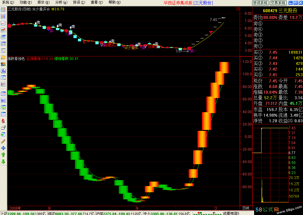 QW1:=(HIGH+LOW+CLOSE*2)/4; QW3:=EMA(QW1,10); QW4:=STD(QW1,10); QW5:=(QW1-QW3)*100/QW4; QW6:=EMA(QW5,5); RK7:=EMA(QW6,10); 红烛看涨:EMA(QW6,10)+100/2-5,LINETHICK1,COLORRED; 绿烛看跌:EMA(红烛看涨,4),COLORGREEN,LINETHICK1; STICKLINE(红烛看涨<REF(红烛看涨,1),红烛看涨,MA(红烛看涨,3),8,0 ),COLOR008800; STICKLINE(红烛看涨<REF(红烛看涨,1),红烛看涨,MA(红烛看涨,3),7,0 ),COLOR009900; STICKLINE(红烛看涨<REF(红烛看涨,1),红烛看涨,MA(红烛看涨,3),6,0 ),COLOR00AA00; STICKLINE(红烛看涨<REF(红烛看涨,1),红烛看涨,MA(红烛看涨,3),5,0 ),COLOR00BB00; {STICKLINE(红烛看涨<REF(红烛看涨,1),红烛看涨,MA(红烛看涨,3),4,0 ),COLOR00CC00;} STICKLINE(红烛看涨> REF(红烛看涨,1),红烛看涨,EMA(红烛看涨,3),0,0) ,COLOR00BBFF; STICKLINE(红烛看涨> REF(红烛看涨,1),红烛看涨,EMA(红烛看涨,3),8,0) ,COLOR0011FF; STICKLINE(红烛看涨> REF(红烛看涨,1),红烛看涨,EMA(红烛看涨,3),7,0) ,COLOR0022FF; STICKLINE(红烛看涨> REF(红烛看涨,1),红烛看涨,EMA(红烛看涨,3),6,0) ,COLOR0044FF; STICKLINE(红烛看涨> REF(红烛看涨,1),红烛看涨,EMA(红烛看涨,3),5,0) ,COLOR0066FF; STICKLINE(红烛看涨> REF(红烛看涨,1),红烛看涨,EMA(红烛看涨,3),4,0) ,COLOR0088FF; STICKLINE(红烛看涨> REF(红烛看涨,1),红烛看涨,EMA(红烛看涨,3),3,0) ,COLOR0099FF; STICKLINE(红烛看涨> REF(红烛看涨,1),红烛看涨,EMA(红烛看涨,3),2,0) ,COLOR00AAFF; STICKLINE(红烛看涨> REF(红烛看涨,1),红烛看涨,EMA(红烛看涨,3),1,0) ,COLOR00BBFF; |