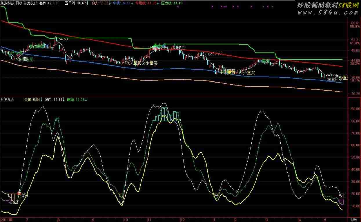 金黄:SMA(RSV3,5,1),COLORYELLOW,LINETHICK2; 银白:SMA(SMA(RSV1,3,1),3,1)+3*STD(CLOSE,21),COLORWHITE; 铜绿:SMA(RSV2,5,1)+2*STD(CLOSE,37),COLORGREEN;
