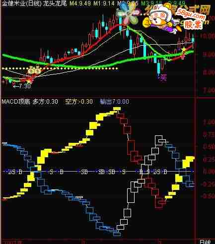 VAR1 := EMA(CLOSE,5) - EMA(CLOSE,30); X:=VAR1; 多方:X; MX:=EMA(X,3); STICKLINE(X>=MX,X,MX,8,0),COLORYELLOW,LINETHICK2; STICKLINE(X<MX,X,MX,8,1),COLORRED,LINETHICK2; X1:=-VAR1; 空方:X1; MX1:=EMA(X1,3); STICKLINE(X1>=MX1,X1,MX1,8,1),COLORWHITE,LINETHICK2; STICKLINE(X1<MX1,X1,MX1,8,1),COLORFF9900,LINETHICK2; 0,COLORFFA2AF; {WN万能超短买卖}