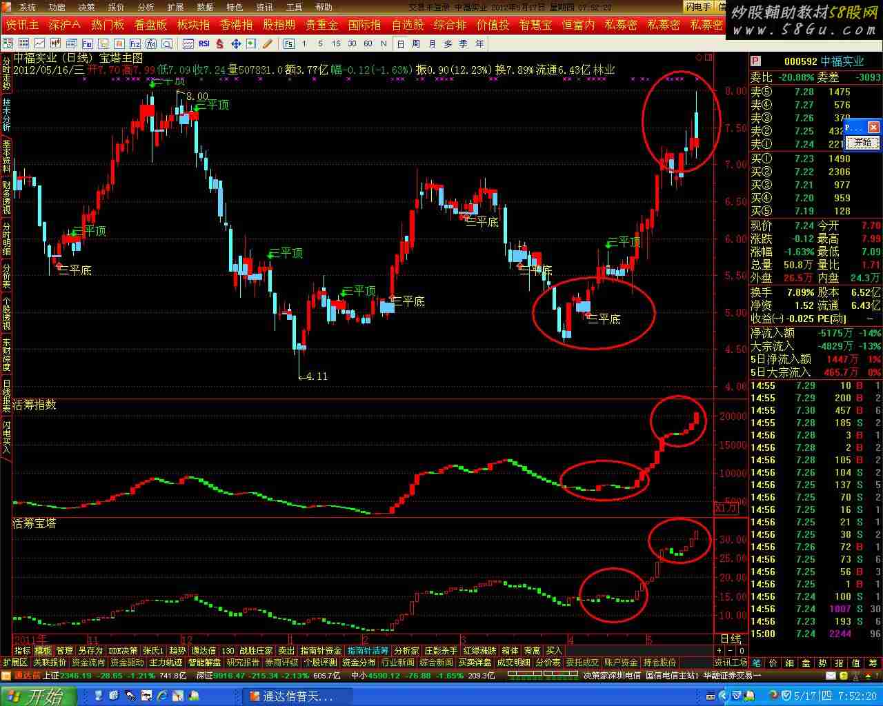 宝塔主图 B1:=REF(C,1);B2:=REF(C,2); SS:=IF(C>REF(C,1) AND REF(C,1)>=REF(C,2),1,IF(C<REF(C,1) AND REF(C,1)<=REF(C,2),-1,IF(C>REF(C,2) AND REF(C,2)>REF(C,1),2,IF(C<REF(C,2) AND REF(C,2)<REF(C,1),-2,0)))); SM:=IF(REF(SS,1)!=0,REF(SS,1),IF(REF(SS,2)!=0,REF(SS,2),IF(REF(SS,3)!=0,REF(SS,3),IF(REF(SS,5)!=0,REF(SS,5),IF(REF(SS,6)!=0,REF(SS,6),IF(REF(SS,7)!=0,REF(SS,7),0)))))); STICKLINE(SS=1 OR SM>=1 AND SS=0,B1,C,3,0),COLORRED; STICKLINE(SS=-1 OR SM<=-1 AND SS=0,B1,C,3,0),COLORFFCC66; STICKLINE(SS=2,B2,C,3,0),COLORRED; STICKLINE(SS=-2,B2,C,3,0),COLORFFCC66; STICKLINE((SS=-1 OR SS=-2) AND SM>0,B2,B1,3,0),COLORRED; STICKLINE((SS=1 OR SS=2) AND SM<0,B2,B1,3,0),COLORFFCC66; AA:=CLOSE>REF(CLOSE,1) AND REF(CLOSE,1)>REF(CLOSE,2) AND REF(CLOSE,1)<REF(CLOSE,3) AND IF(REF(CLOSE,3)<REF(CLOSE,4),1,IF(REF(CLOSE,4)<REF(CLOSE,5),REF(CLOSE,1)<REF(CLOSE,4) OR (REF(CLOSE,2)<REF(CLOSE,4) AND REF(CLOSE,3)>=REF(CLOSE,5)),IF(REF(CLOSE,5)<REF(CLOSE,6),1,REF(CLOSE,6)<REF(CLOSE,7)))); BB:=CLOSE<REF(CLOSE,1) AND REF(CLOSE,1)<REF(CLOSE,2) AND REF(CLOSE,1)>REF(CLOSE,3) AND IF(REF(CLOSE,3)>REF(CLOSE,4),1,IF(REF(CLOSE,4)>REF(CLOSE,5),REF(CLOSE,1)>REF(CLOSE,4) OR (REF(CLOSE,2)>REF(CLOSE,4) AND REF(CLOSE,3)<=REF(CLOSE,5)),IF(REF(CLOSE,5)>REF(CLOSE,6),1,REF(CLOSE,6)>REF(CLOSE,7)))); DRAWICON(AA AND CLOSE>REF(OPEN,2),0.99*LOW,1); DRAWICON(BB AND CLOSE<REF(CLOSE,2),HIGH*1.01,2); DRAWTEXT(AA AND CLOSE>REF(OPEN,2),LOW*0.98,'三平底'),COLORYELLOW; DRAWTEXT(BB AND CLOSE<REF(CLOSE,2),HIGH*1.02,'三平顶'),COLOR00FF00;活筹宝塔VAR11:=SMA(AMOUNT,15,1)/5670000; VAR22:=MA(REF(CLOSE,1),5); VAR2:=VAR11*CLOSE/VAR22; B0:=REF(VAR2-O,2); B1:=REF(VAR2,1); B2:=REF(VAR2,2); B3:=REF(VAR2,3); B4:=REF(VAR2,4); VAR2MAX:=MAX(MAX(MAX(VAR2,B1),B2),B3); VAR2MIN:=MIN(MIN(MIN(VAR2,B1),B2),B3); RS1:=(VAR2=VAR2MAX AND (B1>=B2 OR B1>=B3)) OR (B1=VAR2MAX AND (B2=VAR2MIN OR B3=VAR2MIN) AND VAR2>=B2) OR (B2=VAR2MAX AND B3=VAR2MIN AND VAR2>=B1) OR (B3=VAR2MAX AND VAR2>=B1 AND VAR2>=B2); RS2:=VAR2=VAR2MAX AND B1=VAR2MIN; RS3:=(B1=VAR2MAX AND VAR2<B2) OR (B2=VAR2MAX AND B1>B3) OR (B3=VAR2MAX AND B1>B2 AND B2>=B4 AND VAR2<B1); STICKLINE(RS1,B1,VAR2,2,1),COLORRED; STICKLINE(RS2,B2,VAR2,2,1),COLORRED; STICKLINE(RS3,B1,B2,2,1),COLORRED; GS1:=(VAR2=VAR2MIN AND (B1<B2 OR B1<B3)) OR (B1=VAR2MIN AND (B2=VAR2MAX OR B3=VAR2MAX) AND VAR2<B2) OR (B2=VAR2MIN AND B3=VAR2MAX AND VAR2<B1) OR (B3=VAR2MIN AND VAR2<B1 AND VAR2<B2); GS2:=B1=VAR2MAX AND VAR2=VAR2MIN; GS3:=(B1=VAR2MIN AND VAR2>=B2) OR (B2=VAR2MIN AND B1<=B3) OR (B3=VAR2MIN AND B1<=B2 AND B2<B4 AND VAR2>=B1); STICKLINE(GS1,B1,VAR2,2,0),COLORGREEN; STICKLINE(GS2,B2,VAR2,2,0),COLORGREEN; STICKLINE(GS3,B1,B2,2,0),COLORGREEN;活筹指数{0AMV活筹指数} VAR1:=AMOUNT; VAR2:=SMA(VAR1,10,1); VAR3:=REF(VAR2,1); STICKLINE(VAR2>VAR3,VAR2,VAR3,3,0),COLORRED; STICKLINE(VAR2<VAR3,VAR2,VAR3,3,0),COLORGREEN;