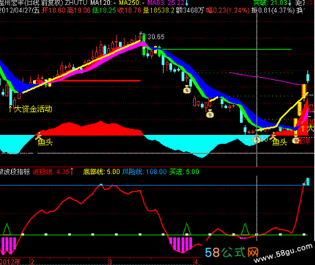 波段线: 5*SMA((CLOSE-LLV(LOW,27))/(HHV(HIGH,27)-LLV(LOW,27))*100,5,1)-3*SMA(SMA ((CLOSE-LLV(LOW,27))/(HHV(HIGH,27)-LLV(LOW,27))*100,5,1),3,1)-SMA(SMA(SMA ((CLOSE-LLV(LOW,27))/(HHV(HIGH,27)-LLV(LOW,27))*100,5,1),3,1),2,1),LINETHICK2,COLORRED; M1:=EMA(MA(波段线,5),3); STICKLINE(波段线>108 AND 波段线>=M1,波段线,108,2,0),COLORF0F000; STICKLINE(波段线<0 AND 波段线<M1,波段线,0,2,0),COLORF00FF0; 底部线: 5,COLOR00FFFF; 风险线: 108,COLORFF9D00; 底部买:=LLV(波段线,2)=LLV(波段线,8); 买进:IF(CROSS(波段线,REF(波段线+0.01,1)) AND 底部买 AND 波段线<0,30,5); |