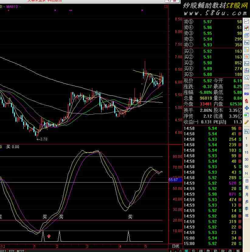 地狱底:0,COLORGRAY; 地狱线:10,COLORGRAY; 地平线:20,COLORLIMAGENTA; 天际线:80,COLORGRAY; RSV:=(((CLOSE - LLV(LOW,33)) / (HHV(HIGH,33) - LLV(LOW,33))) * 100); 神仙:SMA(RSV,7,1),COLORWHITE; 魔鬼:SMA(SMA(RSV,7,1),3,1),COLORYELLOW; 轨迹:SMA(SMA(SMA(RSV,6,1),5,1),3,1),COLORMAGENTA; 财神到:IF(CROSS(神仙,20),20,0),POINTDOT; DRAWICON((CROSS(神仙,20)),5,1); LC:=REF(CLOSE,1); RSI:=((SMA(MAX((CLOSE - LC),0),3,1) / SMA(ABS((CLOSE - LC)),3,1)) * 100); FF:=EMA(CLOSE,3); MA15:=EMA(CLOSE,21); MRD:=CROSS(FF,MA15); DRAWTEXT(MRD ,25 ,'买' ),COLORFFFFFF; 买: IF(MRD ,10 ,0),COLORFFFFFF;