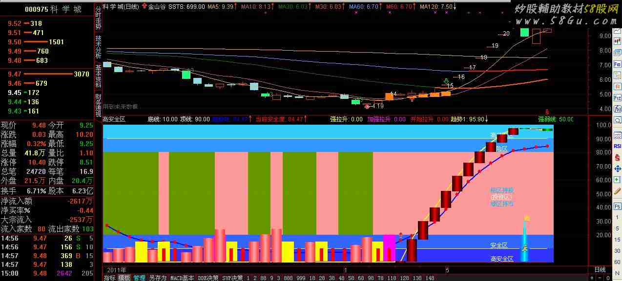 【高安全买入区】一定要学会在下的途中买入RSVA1:=(CLOSE-LLV(LOW,9))/(HHV(HIGH,9)-LLV(LOW,9))*100; RSVA2:=100*(HHV(HIGH,9)-CLOSE)/(HHV(HIGH,9)-LLV(LOW,9)); VAR21:=SMA(RSVA2,9,1)+100; VAR11:=SMA(RSVA1,3,1); VAR51:=SMA(VAR11,3,1)+100; 顶底线:=VAR51-VAR21+50; VAR2:=LLV(LOW,33); VAR3:=HHV(HIGH,21); VAR4:=EMA((CLOSE-VAR2)/(VAR3-VAR2)*100,10)*-1+100; 趋势:=100-EMA(0.191*REF(VAR4,1)+0.809*VAR4,1); STICKLINE(C,100,90,4,0),COLORFFCC33; STICKLINE(C,90,80,4,0),COLORFF9933; STICKLINE(顶底线>REF(顶底线,1),20,80,4,0),COLOR9999FF; STICKLINE(顶底线<REF(顶底线,1),20,80,4,0),COLOR009966; STICKLINE((趋势>REF(趋势,1) AND 顶底线<REF(顶底线,1)),20,80,4,0),COLOR9999FF; STICKLINE((趋势<REF(趋势,1) AND 顶底线>REF(顶底线,1)),20,80,4,0),COLOR009966; STICKLINE(C,20,10,4,0),COLORFF6633; STICKLINE(C,10,0,4,0),COLORFF3333; 底线:10,COLORWHITE; 顶线:90,COLORWHITE; 趋势线:100-EMA(0.191*REF(VAR4,1)+0.809*VAR4,1),LINETHICK2,COLORBLUE; 当前安全度:100-EMA(0.191*REF(VAR4,1)+0.809*VAR4,1),CIRCLEDOT,LINETHICK2,COLORRED; DRAWTEXT(CURRBARSCOUNT=6,5,'高安全区'),COLORWHITE; DRAWTEXT(CURRBARSCOUNT=6,15,'安全区'),COLORWHITE; DRAWTEXT(CURRBARSCOUNT=6,45,'绿区持币'),COLORFFC000; DRAWTEXT(CURRBARSCOUNT=6,50,'(投资区)'),COLORWHITE; DRAWTEXT(CURRBARSCOUNT=6,55,'粉区持股'),COLORFFC000; DRAWTEXT(CURRBARSCOUNT=6,85,'风险区'),COLORWHITE; DRAWTEXT(CURRBARSCOUNT=6,95,'高风险区'),COLORWHITE; {强拉升} Y1:=LLV(L,17); Y2:=SMA(ABS(L-REF(L,1)),17,1); Y3:=SMA(MAX(L-REF(L,1),0),17,2); Q:=-(EMA(IF(L<=Y1,Y2/Y3,-3),1)); STICKLINE(CROSS(Q,0),15,0,4,0), , COLORYELLOW; 强拉升: IF(CROSS(Q,0),1,0),COLORYELLOW; Q1:= (CLOSE-MA(CLOSE,40))/MA(CLOSE,40)*100, , COLOR00FF00,LINETHICK2; STICKLINE(CROSS(Q1,-24),20,0,4,0), , COLORMAGENTA; 加强拉升: IF(CROSS(Q1,-24),1,0),COLORMAGENTA; VAR22:=EXPMA(EXPMA(EXPMA((2*CLOSE+HIGH+LOW)/4,4),4),4); 天:=( MA((VAR22-REF(VAR22,1))/REF(VAR22,1)*100,2)); 地:=( MA((VAR22-REF(VAR22,1))/REF(VAR22,1)*100,1)); STICKLINE(地>天 AND 地<0,10,0,1,0),COLORRED; 开始拉升:STICKLINE(地>天 AND 地<0,10,0,1,0)=1,COLORRED; {<<波段绝品>>} VAR1B:=(HHV(HIGH,9)-CLOSE)/(HHV(HIGH,9)-LLV(LOW,9))*100-70; VAR2B:=SMA(VAR1B,9,1)+100; VAR3B:=(CLOSE-LLV(LOW,9))/(HHV(HIGH,9)-LLV(LOW,9))*100; VAR4B:=SMA(VAR3B,3,1); VAR5B:=SMA(VAR4B,3,1)+100; VAR6B:=VAR5B-VAR2B; 趋势1: IF(VAR6B>45,VAR6B-45,0),COLOR00FFFF,LINETHICK2; VAR2Q:=REF(LOW,1); VAR3Q:=SMA(ABS(LOW-VAR2Q),3,1)/SMA(MAX(LOW-VAR2Q,0),3,1)*100; VAR4Q:=EMA(IF(CLOSE*1.3,VAR3Q*10,VAR3Q/10),3); VAR5Q:=LLV(LOW,30); VAR6Q:=HHV(VAR4Q,30); VAR7Q:=IF(MA(CLOSE,58),1,0); VAR8Q:=EMA(IF(LOW<=VAR5Q,(VAR4Q+VAR6Q*2)/2,0),3)/999*VAR7Q; 火焰山:=IF(VAR8Q>100,100,VAR8Q); STICKLINE(火焰山>0 AND 火焰山>REF(火焰山,1),0 ,火焰山*1.2,3.5,0 ),COLOR4444FF; STICKLINE(火焰山>0 AND 火焰山>REF(火焰山,1),0 ,火焰山*1.2,2.5,0 ),COLOR5555FF; STICKLINE(火焰山>0 AND 火焰山>REF(火焰山,1),0 ,火焰山*1.2,1.5,0 ),COLOR7777FF; STICKLINE(火焰山>0 AND 火焰山>REF(火焰山,1),0 ,火焰山*1.2,0.5,0 ),COLOR9999FF; STICKLINE(REF(趋势1,1)< 趋势1, 趋势1,REF(趋势1,1),3.5,0),COLOR000033; STICKLINE(REF(趋势1,1)< 趋势1, 趋势1,REF(趋势1,1),2.8,0),COLOR000055; STICKLINE(REF(趋势1,1)< 趋势1, 趋势1,REF(趋势1,1),2.0,0),COLOR000077; STICKLINE(REF(趋势1,1)< 趋势1, 趋势1,REF(趋势1,1),1.2,0),COLOR000099; STICKLINE(REF(趋势1,1)< 趋势1, 趋势1,REF(趋势1,1),0.4,0),COLOR0000DD; STICKLINE(REF(趋势1,1)> 趋势1, 趋势1,REF(趋势1,1),3.5,0),COLOR003300; STICKLINE(REF(趋势1,1)> 趋势1, 趋势1,REF(趋势1,1),2.8,0),COLOR005500; STICKLINE(REF(趋势1,1)> 趋势1, 趋势1,REF(趋势1,1),2.0,0),COLOR007700; STICKLINE(REF(趋势1,1)> 趋势1, 趋势1,REF(趋势1,1),1.2,0),COLOR009900; STICKLINE(REF(趋势1,1)> 趋势1, 趋势1,REF(趋势1,1),0.4,0),COLOR00DD00; 逃顶:=CROSS(82,RSI); STICKLINE( 逃顶,逃顶,10,3.5,0),COLORFF5500; STICKLINE( 逃顶,逃顶,15,2.5,0),COLORFF8800; STICKLINE( 逃顶,逃顶,20,1.5,0),COLORFFAA00; STICKLINE( 逃顶,逃顶,25,0.5,0),COLORFFCC00; STICKLINE( 逃顶,逃顶,30,0.1,0),COLORFFFF00; D1:=(C+L+H)/3; D2:=EMA(D1,6); D3:=EMA(D2,5); BBUY:=CROSS(D2,D3); 强弱线:50,COLORGREEN,POINTDOT; DRAWICON(BBUY,20,1); VARR1:=SMA(MAX(CLOSE-REF(C,1),0),6,1)/SMA(ABS(CLOSE-REF(C,1)),6,1)*100; DRAWICON(CROSS(82,VARR1),10,15); DRAWTEXT(CROSS(82,VARR1),35,'逃'),COLORYELLOW; |