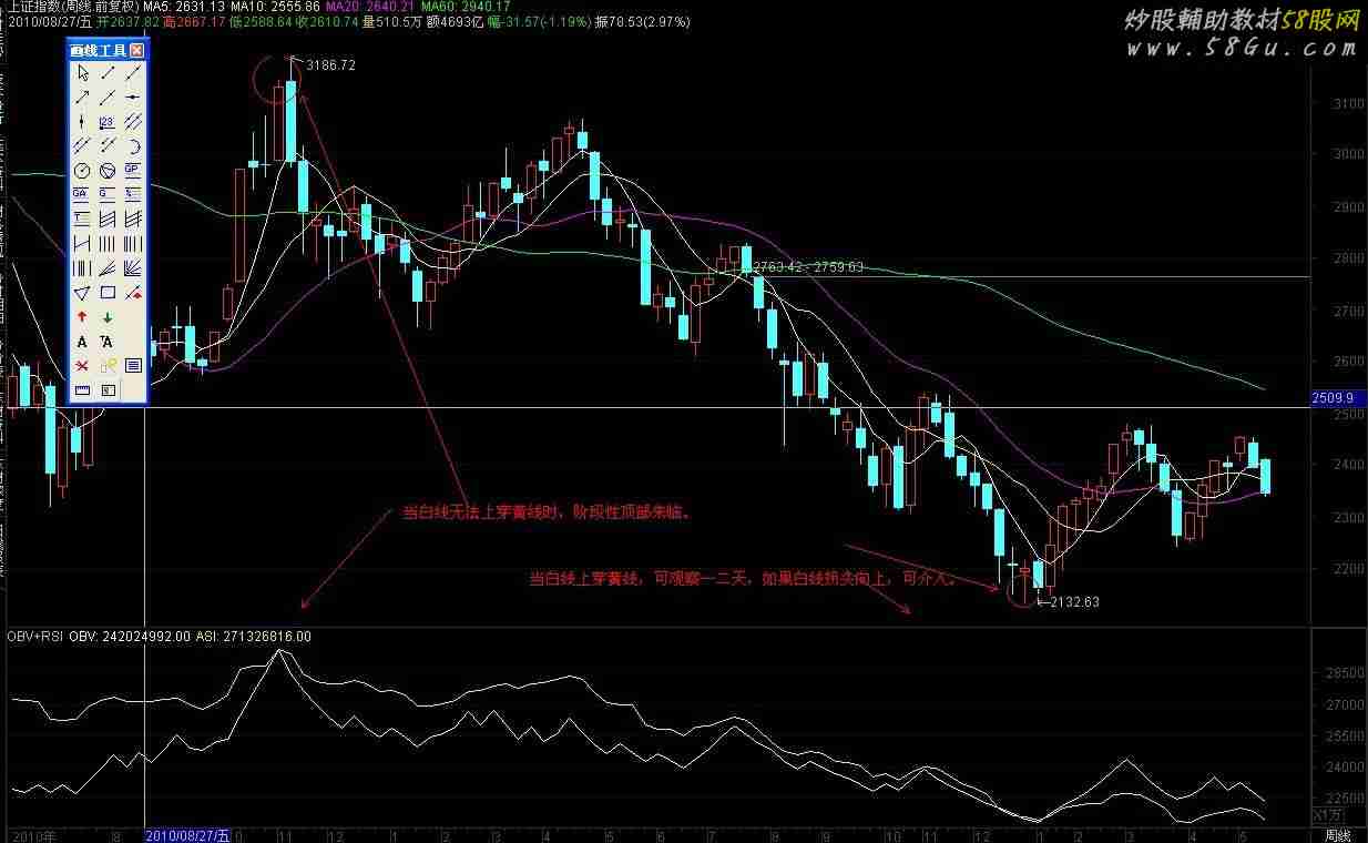 OBV:SUM(IF(C>REF(C,1),V,IF(C<REF(C,1),-V,0)),0); LC:=REF(C,1); AA:=ABS(H-LC); BB:=ABS(L-LC); CC:=ABS(H-REF(L,1)); DD:=ABS(LC-REF(O,1)); R:=IF(AA>BB AND AA>CC,AA+BB/2+DD/4,IF(BB>CC AND BB>AA,BB+AA/2+DD/4,CC+DD/4)); X:=(C-LC+(C-O)/2+LC-REF(O,1)); SI1:=16*X/R*MAX(AA,BB); AS:=SUM(SI1,0); F:=CONST(LLV(AS,90)); B:=CONST(HHV(AS,90))-F; D:=CONST(LLV(OBV,90)); J:=CONST(HHV(OBV,90))-D; BI:=(AS-F)/B; ASI:BI*J+D;