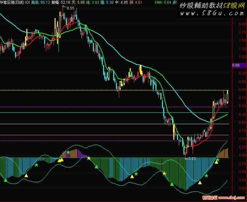 年:=1+(BARSLAST(YEAR!=REF(YEAR,1) OR DATETODAY(DATE)=1)); 天数:=IF(PERIOD=5,年,DRAWNULL); 高1:=HHV(H,天数); 低1:=LLV(L,天数); 高低:(C-低1)/(高1-低1)*100,,NODRAW,COLORFFFF00; 振幅:(高1-低1)/低1*100,NODRAW,COLORWHITE; 天:CONST(高1),NODRAW,COLORYELLOW; 地:CONST(低1),NODRAW,COLOR00FF00; 强:CONST(高1-(高1-低1)*1/3),NODRAW,COLORFFFF00; 中:CONST(高1-(高1-低1)*1/2),NODRAW,COLORWHITE; 弱:CONST(高1-(高1-低1)*2/3),NODRAW,COLOR0099FF; STICKLINE(C>0,CONST(高1-(高1-低1)*1/4),CONST(高1-(高1-低1)*1/4),2,0),COLORFF00FF; STICKLINE(C>0,CONST(高1-(高1-低1)*3/4),CONST(高1-(高1-低1)*3/4),2,0),COLORFF00FF; STICKLINE(C>0,天,天,10,0),COLORYELLOW; STICKLINE(C>0,地,地,10,0),COLOR00FF00; STICKLINE(C>0,强,强,10,0),COLORFFFF00; STICKLINE(C>0,中,中,10,0),COLORWHITE; STICKLINE(C>0,弱,弱,10,0),COLOR0099FF; N:=12; DP:=(H+L+2*C)/4; DN:=ABS(CLOSE-REF(CLOSE,N)); VY:=SUM(ABS(CLOSE-REF(CLOSE,1)),N); ER:=DN/VY; FSC:=2/(2+1); SSC:=2/(N+1); SC:=ER*(FSC-SSC)+SSC; SCSQ:=SC*SC; KMA:DMA(DP,SCSQ),COLOR00FF00,LINETHICK2; 多空:EMA(DP,50),COLORFFFF00,LINETHICK2; RC:=地; DK:=(EMA(DP,12)-多空); STICKLINE(DK>0 AND DK>REF(DK,1),RC,RC+DK,1,0),COLOR006699; STICKLINE(DK>0 AND DK<=REF(DK,1),RC,RC+DK,1,1),COLORFF00AA; STICKLINE(DK<0 AND DK>REF(DK,1),RC,RC+DK,1,0),COLOR998800; STICKLINE(DK<0 AND DK<=REF(DK,1),RC,RC+DK,1,1),COLOR009900; BUY:=KMA>EMA(KMA,3); DRAWKLINE(H,O,L,C); 【量H】:=IF((AMOUNT/C)/(HHV(AMOUNT,21)/HHV(C,21))*100>100,100,(AMOUNT/C)/(HHV(AMOUNT,21)/HHV(C,21))*100); STICKLINE(【量H】=100,L,H,0.4,0),COLORYELLOW; STICKLINE(【量H】=100 AND C>=O,C,O,4,1),COLORYELLOW; STICKLINE(【量H】=100 AND C<O,C,O,4,0),COLORYELLOW; ZDF:=(C-REF(C,1))/REF(C,1)*100; STICKLINE(ZDF>9.8,O,C,2,0),COLORRED; STICKLINE(ZDF<-9.8,O,C,2,0),COLORBLUE; Q43:CONST(高1-(高1-低1)*1/4),NODRAW; Q41:CONST(高1-(高1-低1)*3/4),NODRAW; DK1:=DK+RC; M20:=MA(DK1,20); S:=STD(DK1,20); 高:=M20+2*S; 低:=M20-2*S; 【上】: 高,COLORFFFF00; 【下】: 低,COLORFFFF00; DRAWTEXT(CROSS(高,DK1),高,'★'),COLOR00FF00; DRAWTEXT(CROSS(DK1,高),高,'▲'),COLORYELLOW; DRAWTEXT(CROSS(DK1,低),低,'▲'),COLOR00FF00; DRAWTEXT(CROSS(低,DK1),低,'★'),COLORYELLOW; IF(多空>MA(DP,50),多空,DRAWNULL),COLOR00FF00,LINETHICK2; IF(BUY=1,KMA,DRAWNULL),COLORRED,LINETHICK2;
