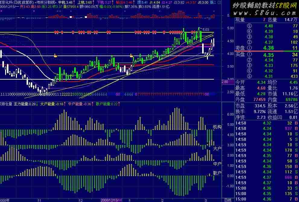换手:=V*100/CAPITAL; 主力:=MA(换手,4); 大户:=MA(换手,9); 中户:=MA(换手,17); 散户:=MA(换手,34); 均量:=(主力+大户+中户+散户)/4; 主力能量:(主力-均量),NODRAW; 大户能量:(大户-均量),NODRAW; 中户能量:(中户-均量),NODRAW; 散户能量:(散户-均量),NODRAW; 操盘:STICKLINE(主力能量>=0 AND 主力能量>=REF(主力能量,1),4.5,4.5+主力能量,1,1),COLORYELLOW; 减仓:STICKLINE(主力能量>=0 AND 主力能量< REF(主力能量,1),4.5,4.5+主力能量,1,1),COLORYELLOW; 反弹:STICKLINE(主力能量<0 AND 主力能量>=REF(主力能量,1),4.5,4.5+主力能量,1,1),COLORGREEN; 寻底:STICKLINE(主力能量<0 AND 主力能量< REF(主力能量,1),4.5,4.5+主力能量,1,1),COLORGREEN; DRAWTEXT(ISLASTBAR=1,IF(主力能量>=0,4.2,4.8),'机构'),COLORWHITE;