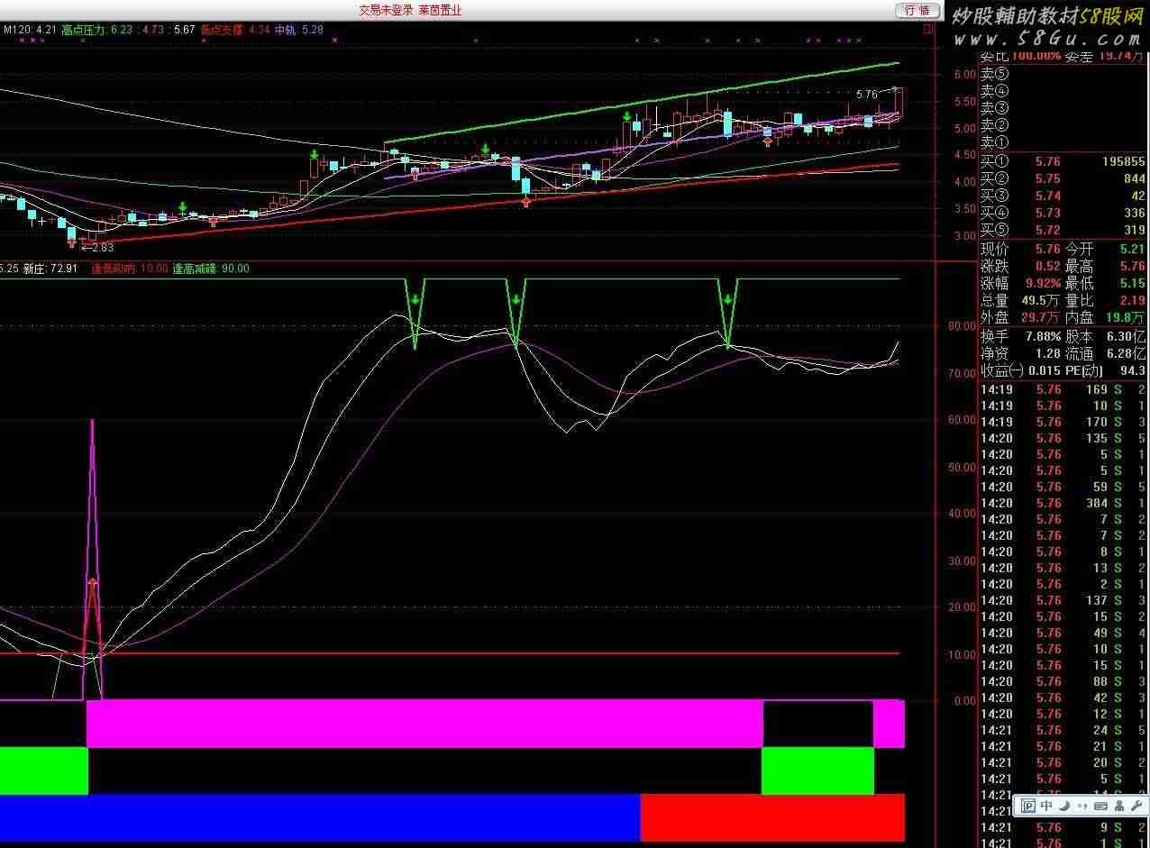RSV:=(((CLOSE - LLV(LOW,33)) / (HHV(HIGH,33) - LLV(LOW,33))) * 100); SMA(RSV,7,1); SMA(SMA(RSV,7,1),4,1); SMA(SMA(SMA(RSV,7,1),4,1),6,1); (((CLOSE / COST(8)) <= 0.8) * 10); 20,POINTDOT; 80,POINTDOT; K:=SMA(RSV,7,1); D:=SMA(K,3,1); J:=3*K-2*D; 底部:IF(CROSS(J,7.6),60,0),COLORMAGENTA,LINETHICK2; VAR3:=(2*CLOSE+HIGH+LOW)/4; VAR4:=LLV(LOW,34); VAR5:=HHV(HIGH,34); 散户: EMA((VAR3-VAR4)/(VAR5-VAR4)*100,13),LINETHICK1,COLOR00FF99,NODRAW; 新庄: EMA(0.667*REF(散户,1)+0.333*散户,2),LINETHICK1,COLORYELLOW,NODRAW; DRAWICON(CROSS(散户,新庄) AND 散户<22,25,1); DRAWICON(CROSS(新庄,散户) AND 新庄>75,85,2); 逢低吸呐: IF(CROSS(散户,新庄) AND 散户<40,25,10),COLORRED,LINETHICK2; 逢高减磅: IF(CROSS(新庄,散户) AND 新庄>75,75,90),COLORGREEN,LINETHICK2; {KDJ月金} 月K:="KDJ.K#MONTH"(9,3,3); 月J:="KDJ.J#MONTH"(9,3,3); {KDJ周金} 周K:="KDJ.K#WEEK"(9,3,3); 周J:="KDJ.J#WEEK"(9,3,3); {KDJ日金} 日K:="KDJ.K#DAY"(9,3,3); 日J:="KDJ.J#DAY"(9,3,3); 月死叉:STICKLINE(月J<月K,-20,-30,4,0),COLORBLUE; 月金叉:STICKLINE(月J>月K,-20,-30,4,0),COLORRED; 周死叉:STICKLINE(周J<周K,-20,-10,4,0),COLORGREEN; 周金叉:STICKLINE(周J>周K,0,-10,4,0),COLORFF00FF; |