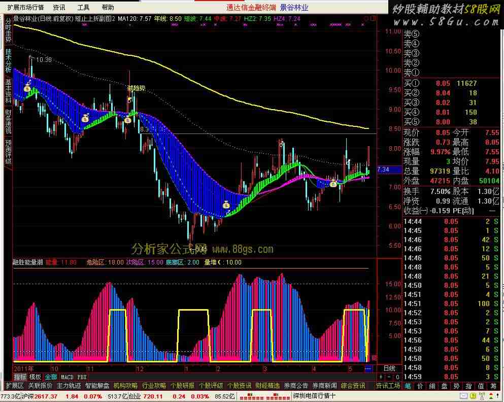 {通达信版融胜解盘用的能量潮} VAR2:=(CLOSE-LLV(LOW,24))/(HHV(HIGH,24)-LLV(LOW,24))*200*10; 能量: SMA(VAR2,5,1)/100,COLORRED; DRAWBAND(能量>REF(能量,1),RGB(250,0,120),0,RGB(0,180,180)); STICKLINE(能量>REF(能量,1),0,能量,2.5,0),COLOR7800FF; STICKLINE(能量<REF(能量,1),0,能量,2.5,0),COLORFF7800; 危险区:18,COLOR208FFF; 次险区:15,COLORFF33FF,DOTLINE; VAR3:=VOL/((HIGH-LOW)*2-ABS(CLOSE-OPEN)); VAR4:=(IF(CLOSE>OPEN,VAR3*(HIGH-LOW),IF(CLOSE<OPEN,VAR3*(HIGH-OPEN+CLOSE-LOW),VOL/2))/(IF(CLOSE>OPEN,0-VAR3*(HIGH-CLOSE+OPEN-LOW),IF(CLOSE<OPEN,0-VAR3*(HIGH-LOW),0-VOL/2))*(-1))-IF(CLOSE>OPEN,0-VAR3*(HIGH-CLOSE+OPEN-LOW),IF(CLOSE<OPEN,0-VAR3*(HIGH-LOW),0-VOL/2))*(-1)/IF(CLOSE>OPEN,VAR3*(HIGH-LOW),IF(CLOSE<OPEN,VAR3*(HIGH-OPEN+CLOSE-LOW),VOL/2))); VAR5:=AMOUNT/(100*VOL); VAR6:=MA(VAR5,40); VAR7:=100*(CLOSE-VAR6)/VAR6; 底部区: IF(VAR4>0 AND VAR7<-12 AND CLOSE/OPEN>1.07,300,200)/100,COLORFFFF00,DOTLINE; DRAWTEXT(ISLASTBAR,1.5,' 能量潮'),COLOR7800FF ;量堆:=COUNT(V>=REF(V,1)*2,BARSLAST(CROSS(C,MA(C,20)))); 量堆(:IF(量堆=1,1000,0)/100,COLORYELLOW,LINETHICK3;