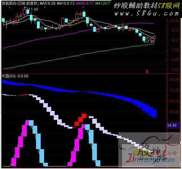 VAR1:=HHV(HIGH,9)-LLV(LOW,9);VAR2:=HHV(HIGH,9)-CLOSE;VAR3:=CLOSE-LLV(LOW,9); VAR4:=VAR2/VAR1*100-70;VAR5:=(CLOSE-LLV(LOW,60))/(HHV(HIGH,60)-LLV(LOW,60))*100; VAR6:=(2*CLOSE+HIGH+LOW)/4;VAR7:=SMA(VAR3/VAR1*100,3,1);VAR8:=LLV(LOW,34); VAR9:=SMA(VAR7,3,1)-SMA(VAR4,9,1);ORGVARA:=IF(VAR9>100,VAR9-100,0);VARA:=IF(VAR9>100,VAR9-100,0); VARB:=HHV(HIGH,34);AA:= VARA*2;BB:= EMA((VAR6-VAR8)/(VARB-VAR8)*100,13); VARC:=EMA(0.667*REF(BB,1)+0.333*BB,2);CC:= SMA(VAR5,20,1);VARD:=SMA(AA,2,1)-AA; VARE:=EMA(0.667*REF(BB,1)+0.333*BB,2)-BB;VAR1A:=(HHV(HIGH,9)-CLOSE)/(HHV(HIGH,9)-LLV(LOW,9))*100-70; VAR2A:=SMA(VAR1A,9,1)+100;VAR3A:=(CLOSE-LLV(LOW,9))/(HHV(HIGH,9)-LLV(LOW,9))*100; VAR4A:=SMA(VAR3A,3,1);VAR5A:=SMA(VAR4A,3,1)+100;VAR6A:=VAR5A-VAR2A; S:IF(VAR6A>N,VAR6A-N,0);STICKLINE(BB-VARC>0,BB,VARC,5,0),COLORRED; STICKLINE(BB-VARC<0,BB,VARC,5,0),COLORFFCCCC; STICKLINE(CC-SMA(CC,5,1)>0,CC,SMA(CC,5,1),5,0),COLORYELLOW; STICKLINE(CC-SMA(CC,5,1)<0,CC,SMA(CC,5,1),5,0),COLORBLUE; STICKLINE(REF(S,1)<S,S,REF(S,1),5,0),COLORFF00FF; STICKLINE(REF(S,1)>S,S,REF(S,1),5,0),COLORFFCC66;
