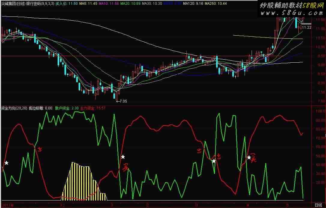 资金方向源码,幅图。也是个相对的资金流入流出,普通的券商通达信软件就可以使用。 波段操作资金进出的幅图指标,主力资金(红线)上穿散户资金(绿线)时买入,配合均线指标操作,效果不错。 m=20;n=20; VAR1:=(HIGH+OPEN+LOW+(2)*(CLOSE))/(5); VAR2:=REF(VAR1,1); VAR3:=MAX(VAR1-VAR2,0); VAR4:=ABS(VAR1-VAR2); VAR5:=SMA(VAR3,10,1); VAR6:=SMA(VAR4,10,1); VAR8:=COUNT(((VAR5)/(VAR6)<0.2),5); 低位吸筹:IF(VAR8>100,100,VAR8)*VAR1; 主力吸筹:STICKLINE(低位吸筹>-150,0,低位吸筹,1,0); 散户资金: 100*(HHV(HIGH,M)-CLOSE)/(HHV(HIGH,M)-LLV(LOW,M)),COLORGREEN,LINETHICK2; RSV:=(CLOSE-LLV(LOW,N))/(HHV(HIGH,N)-LLV(LOW,N))*100; K:=SMA(RSV,3,1); D:=SMA(K,3,1); J:=3*K-2*D; 主力资金:EMA(J,6),COLORRED,LINETHICK2; DRAWTEXT(CROSS(主力资金,散户资金) ,主力资金,'★'); |