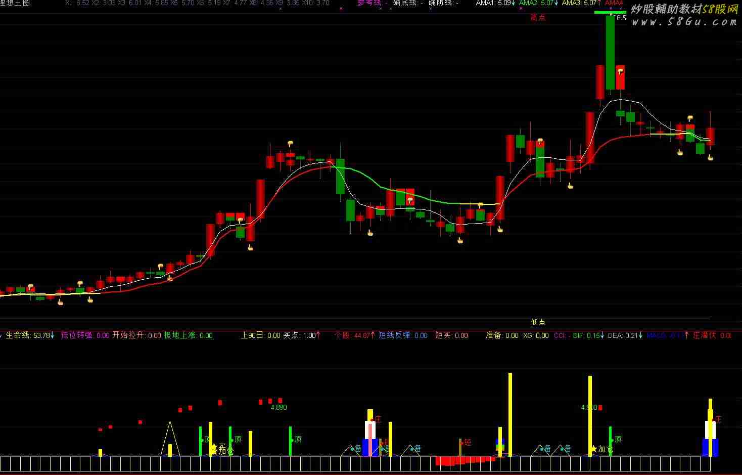 B1:=REF(C,1); B2:=REF(C,2); SS:=IF(C>REF(C,1) AND REF(C,1)>=REF(C,2),1,IF(C<REF(C,1) AND REF(C,1)<=REF(C,2),-1,IF(C>REF(C,2) AND REF(C,2)>REF(C,1),2,IF(C<REF(C,2) AND REF(C,2)<REF(C,1),-2,0)))); SM:=IF(REF(SS,1)!=0,REF(SS,1),IF(REF(SS,2)!=0,REF(SS,2),IF(REF(SS,3)!=0,REF(SS,3),IF(REF(SS,5)!=0,REF(SS,5),IF(REF(SS,6)!=0,REF(SS,6),IF(REF(SS,7)!=0,REF(SS,7),0)))))); STICKLINE(SS=1 OR SM>=1 AND SS=0,B1,C,3,0),COLORRED; STICKLINE(SS=2,B2,C,3,0),COLORRED; STICKLINE((SS=-1 OR SS=-2) AND SM>0,B2,B1,3,0),COLORRED; VAR1:=CLOSE>REF(CLOSE,1) AND CLOSE>REF(CLOSE,2); VAR2:=REF(VAR1,1) AND CLOSE<=REF(CLOSE,1) AND CLOSE>=REF(CLOSE,2); VAR3:=REF(VAR2,1) AND CLOSE>=REF(CLOSE,1) AND CLOSE<=REF(CLOSE,2); VAR4:=REF(VAR3,1) AND CLOSE<=REF(CLOSE,1) AND CLOSE>=REF(CLOSE,2); VAR5:=REF(VAR4,1) AND CLOSE>=REF(CLOSE,1) AND CLOSE<=REF(CLOSE,2); VAR6:=REF(VAR5,1) AND CLOSE<=REF(CLOSE,1) AND CLOSE>=REF(CLOSE,2); VAR7:=REF(VAR6,1) AND CLOSE>=REF(CLOSE,1) AND CLOSE<=REF(CLOSE,2); VAR8:=REF(VAR7,1) AND CLOSE<=REF(CLOSE,1) AND CLOSE>=REF(CLOSE,2); VAR9:=REF(VAR8,1) AND CLOSE>=REF(CLOSE,1) AND CLOSE<=REF(CLOSE,2); VARA:=REF(VAR9,1) AND CLOSE<=REF(CLOSE,1) AND CLOSE>=REF(CLOSE,2); VARB:=REF(VARA,1) AND CLOSE>=REF(CLOSE,1) AND CLOSE<=REF(CLOSE,2); VARC:=REF(VARB,1) AND CLOSE<=REF(CLOSE,1) AND CLOSE>=REF(CLOSE,2); VARD:=CLOSE<REF(CLOSE,1) AND CLOSE<REF(CLOSE,2); VARE:=REF(VARD,1) AND CLOSE>=REF(CLOSE,1) AND CLOSE<=REF(CLOSE,2); VARF:=REF(VARE,1) AND CLOSE<=REF(CLOSE,1) AND CLOSE>=REF(CLOSE,2); VAR10:=REF(VARF,1) AND CLOSE>=REF(CLOSE,1) AND CLOSE<=REF(CLOSE,2); VAR11:=REF(VAR10,1) AND CLOSE<=REF(CLOSE,1) AND CLOSE>=REF(CLOSE,2); VAR12:=REF(VAR11,1) AND CLOSE>=REF(CLOSE,1) AND CLOSE<=REF(CLOSE,2); VAR13:=REF(VAR12,1) AND CLOSE<=REF(CLOSE,1) AND CLOSE>=REF(CLOSE,2); VAR14:=REF(VAR13,1) AND CLOSE>=REF(CLOSE,1) AND CLOSE<=REF(CLOSE,2); VAR15:=REF(VAR14,1) AND CLOSE<=REF(CLOSE,1) AND CLOSE>=REF(CLOSE,2); VAR16:=REF(VAR15,1) AND CLOSE>=REF(CLOSE,1) AND CLOSE<=REF(CLOSE,2); VAR17:=REF(VAR16,1) AND CLOSE<=REF(CLOSE,1) AND CLOSE>=REF(CLOSE,2); VAR18:=REF(VAR17,1) AND CLOSE>=REF(CLOSE,1) AND CLOSE<=REF(CLOSE,2); VAR19:=REF(VARD OR VARE OR VARF OR VAR10 OR VAR11 OR VAR12 OR VAR13 OR VAR14 OR VAR15 OR VAR16 OR VAR17 OR VAR18,1) AND VAR1; VAR1A:=REF(VAR1 OR VAR2 OR VAR3 OR VAR4 OR VAR5 OR VAR6 OR VAR7 OR VAR8 OR VAR9 OR VARA OR VARB OR VARC,1) AND VARD; {红} STICKLINE(C>O,C,O,3,0),COLOR000077; STICKLINE(C>O,C,O,2,0),COLOR000099; STICKLINE(C>O,C,O,1,0),COLOR0000BB; STICKLINE(C>O,H,L,0,0),COLOR0000FF; {绿} STICKLINE(C<O,C,O,3,0),COLOR008000; STICKLINE(C<O,C,O,2,0),COLOR008000; STICKLINE(C<O,C,O,1,0),COLOR008000; STICKLINE(C<O,H,L,0,0),COLOR008000; TC1:=IF(H=HHV(H,8*14),H,DRAWNULL); TC2:=CONST(BARSLAST(TC1=H))+1; UPPER:=CONST(IF(TC2=1,H,REF(H,TC2-1))); BC1:=IF(L=LLV(L,8*20),L,DRAWNULL); BC2:=CONST(BARSLAST(BC1=L))+1; LOWER:=CONST(IF(BC2=1,L,REF(L,BC2-1))); LP:=CURRBARSCOUNT<=BC2 AND L=LOWER;{低点定位} HP:=CURRBARSCOUNT<=TC2 AND H=UPPER;{高点定位}; STICKLINE(LP,L*0.992,L,13,0),COLORFF00FF; STICKLINE(HP,H,H*1.005,13,0),COLOR00FF00; X1:IF(CURRBARSCOUNT<=MAX(BC2,TC2),UPPER,DRAWNULL),COLOR89615F; X2:IF(CURRBARSCOUNT<=MAX(BC2,TC2),LOWER,DRAWNULL),COLOR89615F; X3:IF(CURRBARSCOUNT<=MAX(BC2,TC2),IF(BC2>TC2,UPPER-(UPPER-LOWER)*0.146,LOWER+(UPPER-LOWER)*0.146),DRAWNULL),COLOR89615F,NODRAW; X4:IF(CURRBARSCOUNT<=MAX(BC2,TC2),IF(BC2>TC2,UPPER-(UPPER-LOWER)*0.191,LOWER+(UPPER-LOWER)*0.191),DRAWNULL),COLOR89615F,NODRAW; X5:IF(CURRBARSCOUNT<=MAX(BC2,TC2),IF(BC2>TC2,UPPER-(UPPER-LOWER)*0.236,LOWER+(UPPER-LOWER)*0.236),DRAWNULL),COLOR89615F,NODRAW; X6:IF(CURRBARSCOUNT<=MAX(BC2,TC2),IF(BC2>TC2,UPPER-(UPPER-LOWER)*0.382,LOWER+(UPPER-LOWER)*0.382),DRAWNULL),COLOR89615F,NODRAW; X7:IF(CURRBARSCOUNT<=MAX(BC2,TC2),IF(BC2>TC2,UPPER-(UPPER-LOWER)*0.5,LOWER+(UPPER-LOWER)*0.5),DRAWNULL),COLOR89615F,NODRAW; X8:IF(CURRBARSCOUNT<=MAX(BC2,TC2),IF(BC2>TC2,UPPER-(UPPER-LOWER)*0.618,LOWER+(UPPER-LOWER)*0.618),DRAWNULL),COLOR89615F,NODRAW; X9:IF(CURRBARSCOUNT<=MAX(BC2,TC2),IF(BC2>TC2,UPPER-(UPPER-LOWER)*0.764,LOWER+(UPPER-LOWER)*0.764),DRAWNULL),COLOR89615F,NODRAW; X10:IF(CURRBARSCOUNT<=MAX(BC2,TC2),IF(BC2>TC2,UPPER-(UPPER-LOWER)*0.809,LOWER+(UPPER-LOWER)*0.809),DRAWNULL),COLOR89615F,NODRAW; DRAWTEXT(CURRBARSCOUNT=MIN(BC2,TC2)+8,X1,'高点')COLORRED; DRAWTEXT(CURRBARSCOUNT=MIN(BC2,TC2)+8,X2,'低点')COLORYELLOW; DRAWTEXT(CURRBARSCOUNT=MIN(BC2,TC2)+8,X3,'0.146'),NODRAW; DRAWTEXT(CURRBARSCOUNT=MIN(BC2,TC2)+8,X4,'0.191'),NODRAW; DRAWTEXT(CURRBARSCOUNT=MIN(BC2,TC2)+8,X5,'0.236'),NODRAW; DRAWTEXT(CURRBARSCOUNT=MIN(BC2,TC2)+8,X6,'0.382'),NODRAW; DRAWTEXT(CURRBARSCOUNT=MIN(BC2,TC2)+8,X7,'0.5'),NODRAW; DRAWTEXT(CURRBARSCOUNT=MIN(BC2,TC2)+8,X8,'0.618'),NODRAW; DRAWTEXT(CURRBARSCOUNT=MIN(BC2,TC2)+8,X9,'0.764'),NODRAW; DRAWTEXT(CURRBARSCOUNT=MIN(BC2,TC2)+8,X10,'0.809'),NODRAW; CB1:=CONST(IF(TC2>BC2,LOWER,LLV(L,TC2))); CB2:=CONST(BARSLAST(L=CB1)); CB3:=CONST(REF(BARSLAST(O>C),CB2)+CB2); CB4:=IF(CB1<UPPER-(UPPER-LOWER)*0.52,CONST(IF(CB2=0 AND O>C,C,REF(C,CB3))),DRAWNULL); CB5:=IF(CAPITAL=0 AND BC2>TC2,CB4,DRAWNULL); 参考线:IF(CAPITAL=0 AND BC2>TC2 AND CURRBARSCOUNT<=INTPART(CB2+(TC2-CB2)*0.382) AND CURRBARSCOUNT>CB2,CB4,DRAWNULL); DRAWTEXT(CURRBARSCOUNT=INTPART(CB2+(TC2-CB2)*0.382),参考线,'参考线'); 确底线:参考线*1.06; DRAWTEXT(CURRBARSCOUNT=INTPART(CB2+(TC2-CB2)*0.382),确底线,'确底线'); 确防线:确底线*1.06; DRAWTEXT(CURRBARSCOUNT=INTPART(CB2+(TC2-CB2)*0.382),确防线,'确防线'); DRAWTEXT(CURRBARSCOUNT=TC2-8 AND CB5>0,UPPER-(UPPER-LOWER)*0.091,'■确底线仅仅适用于指数'),COLOR3171D0; DRAWTEXT(CURRBARSCOUNT=TC2-8 AND CB5>0,UPPER-(UPPER-LOWER)*0.151,'■请确认已跌去前一波大行情涨幅的百分之52以上'),COLOR3171D0; DRAWTEXT(CURRBARSCOUNT=TC2-8 AND CB5>0,UPPER-(UPPER-LOWER)*0.208,'■跌幅不够百分之52仅仅作为反弹看待而不是新底'),COLOR3171D0; DRAWICON(VAR19,(LOW * 0.98),11); DRAWICON(VAR1A,(H*1.01),12); DIR1:=ABS(CLOSE-REF(CLOSE,5)); VIR1:=SUM(ABS(CLOSE-REF(CLOSE,1)),5); ER1:=DIR1/VIR1; CS1:=ER1*(0.8-2/8)+2/8; CQ1:=CS
