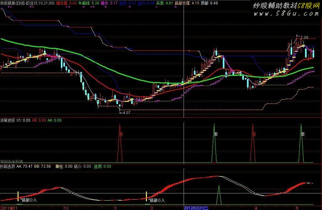 VAR1:=(2*CLOSE+HIGH+LOW)/4; VAR2:=LLV(LOW,34); VAR3:=HHV(HIGH,34); AA:EMA((VAR1-VAR2)/(VAR3-VAR2)*100,13); BB:EMA(0.667*REF(AA,1)+0.333*AA,2) , ; STICKLINE(CROSS(AA,20) AND BB<AA,AA+19,AA-10,1,0),COLORYELLOW; DRAWTEXT(CROSS(AA,22) AND BB<AA,AA-2,'*底部介入'); 黄柱:(CROSS(AA,20) AND BB<AA),COLORYELLOW; 底介:(CROSS(AA,22) AND BB<AA); STICKLINE(BB<AA,AA,BB,4,0),COLORRED; XG:=IF(CROSS(AA,BB) AND AA<20 ,30,0),COLORMAGENTA; 逃顶:IF(FILTER(CROSS(BB,AA) AND AA>80 ,3),60,00),COLORGREEN;