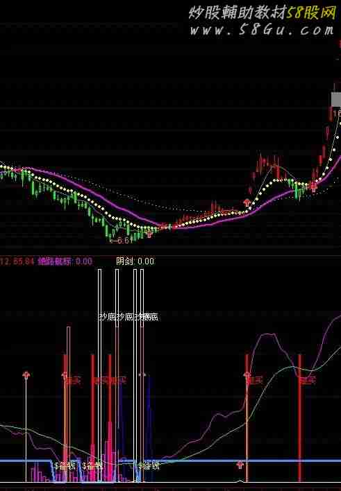 要求5日线上穿十日线后,出现抄底符号后,再介入。N:=3;M:=10; VAR2:=REF(LOW,1); VAR3:=SMA(ABS(LOW-VAR2),3,1)/SMA(MAX(LOW-VAR2,0),3,1)*100; VAR4:=EMA(IF(CLOSE*1.3,VAR3*10,VAR3/10),3); VAR5:=LLV(LOW,30); VAR6:=HHV(VAR4,30); VAR7:=IF(MA(CLOSE,58),1,0); VAR8:=EMA(IF(LOW<=VAR5,(VAR4+VAR6*2)/2,0),3)/618*VAR7; VAR9:=IF(VAR8>100,100,VAR8); STICKLINE(VAR9>-150,0,VAR9,3,1), , COLORFF00FF; 底部吸筹指标:=(CLOSE-MA(CLOSE,40))/MA(CLOSE,40)*100, , COLOR00FF00; STICKLINE(CROSS(底部吸筹指标,-24),100,0,4,1), , COLORFFFFFF; 先知:=(CLOSE-MA(CLOSE,5))/MA(CLOSE,5)*100, , COLORFF00FF; 可能放量拉升: IF(CROSS(底部吸筹指标,-24),1,0), , COLORFFFFFF; 短线获利:STICKLINE(REF("KDJ.J",1)<0 AND "KDJ.J">0,60,0,2,0),COLOR0000FF; VARK1:=(CLOSE-LLV(LOW,27))/(HHV(HIGH,27)-LLV(LOW,27))*100;VARK2:=REVERSE(VARK1); VARK3:=SMA(VARK1,3,1);波段王:=SMA(VARK3,3,1), , COLORRED,LINETHICK2; 波段鬼:=SMA(波段王,2.5,1),COLORYELLOW,LINETHICK2; 趋势线:=3*SMA((CLOSE-LLV(LOW,27))/(HHV(HIGH,27)-LLV(LOW,27))*100,5,1)-2 *SMA(SMA((CLOSE-LLV(LOW,27))/(HHV(HIGH,27)-LLV(LOW,27))*100,5,1),3,1), , COLORFF6666,LINETHICK2;RSV9:=(CLOSE-LLV(LOW,9))/(HHV(HIGH,9)-LLV(LOW,9))*100; K1:=SMA(RSV9,3,1);DK1:=K1-REF(K1,1),COLORSTICK; 出手就赢:IF(DK1>7 AND REF(DK1,1)<0 AND (DK1-REF(DK1,1))>9,50,0), STICK, COLORYELLOW;DRAWICON(出手就赢>0,50 ,1); 买点准备:IF(趋势线<=10,0,10), COLORFF9933,LINETHICK3; STICKLINE( CROSS(趋势线,10),0,73,4,1), COLOR3366FF,; DRAWTEXT(IF(CROSS(趋势线,10),100,0),68,'抄底'),COLORWHITE ; DRAWTEXT(IF(CROSS(10,趋势线),1,0), 10,'$备钱'),COLOR33FFCC,; DRAWTEXT(REF("KDJ.J",1)<0 AND "KDJ.J">0,50,'短买'),,,,COLORRED ,; {分析家公式网-股票公式网站 WWW.GUPANG.COM} DRAWTEXT(CROSS(底部吸筹指标,-24),80,'抄底'),COLORWHITE ,; {绝路航标} VAR11:=(CLOSE-LLV(LOW,60))/(HHV(HIGH,60)-LLV(LOW,60))*80; B:SMA(VAR11,N,1); VAR12:SMA(B,M,1); 绝路航标:IF(CROSS(B,VAR12) AND B<40,50,0); {阴线买入} VAR11AA:=EMA(CLOSE,30)-EMA(CLOSE,17); VAR12AA:=EMA(VAR11AA,5); 九:=TROUGHBARS(3,10,1)<1 AND CROSS(VAR11AA,VAR12AA); DRAWICON(九>0,8,1 ); DRAWTEXT(九,99,'九'),COLOR000000; VAR2A:=(EMA(CLOSE,26)-EMA(CLOSE,52))/MA(CLOSE,60)*100; VAR3A:=EMA(VAR2A,18); VAR4A:=VAR2A<-1; VAR5A:=VAR4A AND CROSS(VAR2A,VAR3A); 追2:=VAR5A; 追涨C:=IF(追2>0,0.8,0),STICK,COLORYELLOW,LINETHICK4 ; XX:=EMA(CLOSE,30)-EMA(CLOSE,17); YY:=EMA(XX,13); 短针2:=TROUGHBARS(3,5,1)<1 AND XX<YY; 阴:=IF(短针2>0,0.4,0),STICK,COLORF0F000,LINETHICK4; DRAWICON(阴>0,8,1 ); DRAWTEXT(阴,85,'阴'),COLOR000000; N1:=30;N2:=17;N3:=5;N4:=6; VAR1X:=EMA(CLOSE,N1)-EMA(CLOSE,N2); VAR2X:=EMA(VAR1X,N3); 剑:=CROSS(VAR1X,VAR2X) AND TROUGHBARS(3,7,1)<1; DRAWICON(剑>0,8,1 ); DRAWTEXT(剑,73,'剑'),COLOR000000; 阴剑: 九 OR 剑 OR 阴;