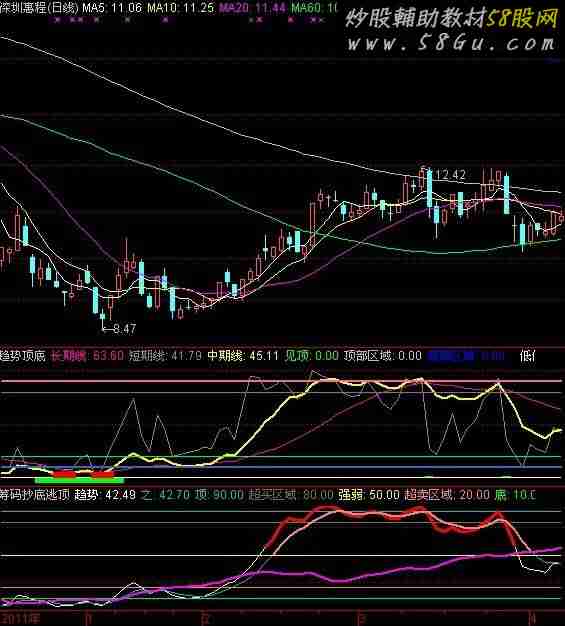 趋势: EMA(EMA(EMA(100*(CLOSE-LLV(LOW,33))/(HHV(HIGH,33)-LLV(LOW,33)),1),2),2); 之: EMA(趋势,5)COLORLIBLUE; 顶:90,COLORLIBLUE; 超买区域:80,COLORBROWN; 强弱:50,COLORYELLOW; 超卖区域:20,COLORLIRED; 底:10,COLORGREEN; A:IF(趋势>=50,趋势,DRAWNULL),COLOR0000FF,LINETHICK3; B:IF(之>=50,之,DRAWNULL),COLORLIRED,LINETHICK2; 散:=EMA(EMA(EMA(EMA((WINNER(C*1.1)-WINNER(C*0.9)),1),2),2),2)*100,COLOR00FFFF,LINETHICK2; 空方筹码:EMA(EMA(EMA(EMA(散,1),2),2),2),COLORMAGENTA,LINETHICK2; |