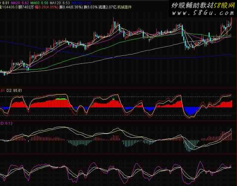 90,DOTLINE,COLORGRAY; 20,DOTLINE,COLORGRAY; LSC:=REF(C,1); RMI:=SMA(MAX(C-LSC,0),7,1)/SMA(ABS(C-LSC),7,1)*100; RMIM:=SMA(RMI,3,1); STICKLINE(RMIM>=50,50,RMIM,4,0),COLOR000080; STICKLINE(RMIM>=50,50,RMIM,3,0),COLOR0000A6; STICKLINE(RMIM>=50,50,RMIM,2,0),COLOR0000CE; STICKLINE(RMIM>=50,50,RMIM,1,0),COLOR0000FF; STICKLINE(RMIM<50,50,RMIM,4,0),COLOR800000; STICKLINE(RMIM<50,50,RMIM,3,0),COLORB00000; STICKLINE(RMIM<50,50,RMIM,2,0),COLORD50000; STICKLINE(RMIM<50,50,RMIM,1,0),COLORFF0000; STICKLINE(RMIM>80,80,RMIM,5,0),COLORGREEN; STICKLINE(RMIM<20,20,RMIM,5,0),COLORWHITE; A:=(C*3+O+H+L)/6; XJ:=(A+0.618*REF(A,1)+0.382*REF(A,2)+0.236*REF(A,3)+0.146*REF(A,4))/2.382; LX:=REF(XJ,1); D1:(SMA(MAX(XJ-LX,0),5,1)/SMA(ABS(XJ-LX),5,1))*100,COLOR0000FF; D2:(SMA(MAX(XJ-LX,0),7,1)/SMA(ABS(XJ-LX),7,1))*100,COLOR00FFFF;