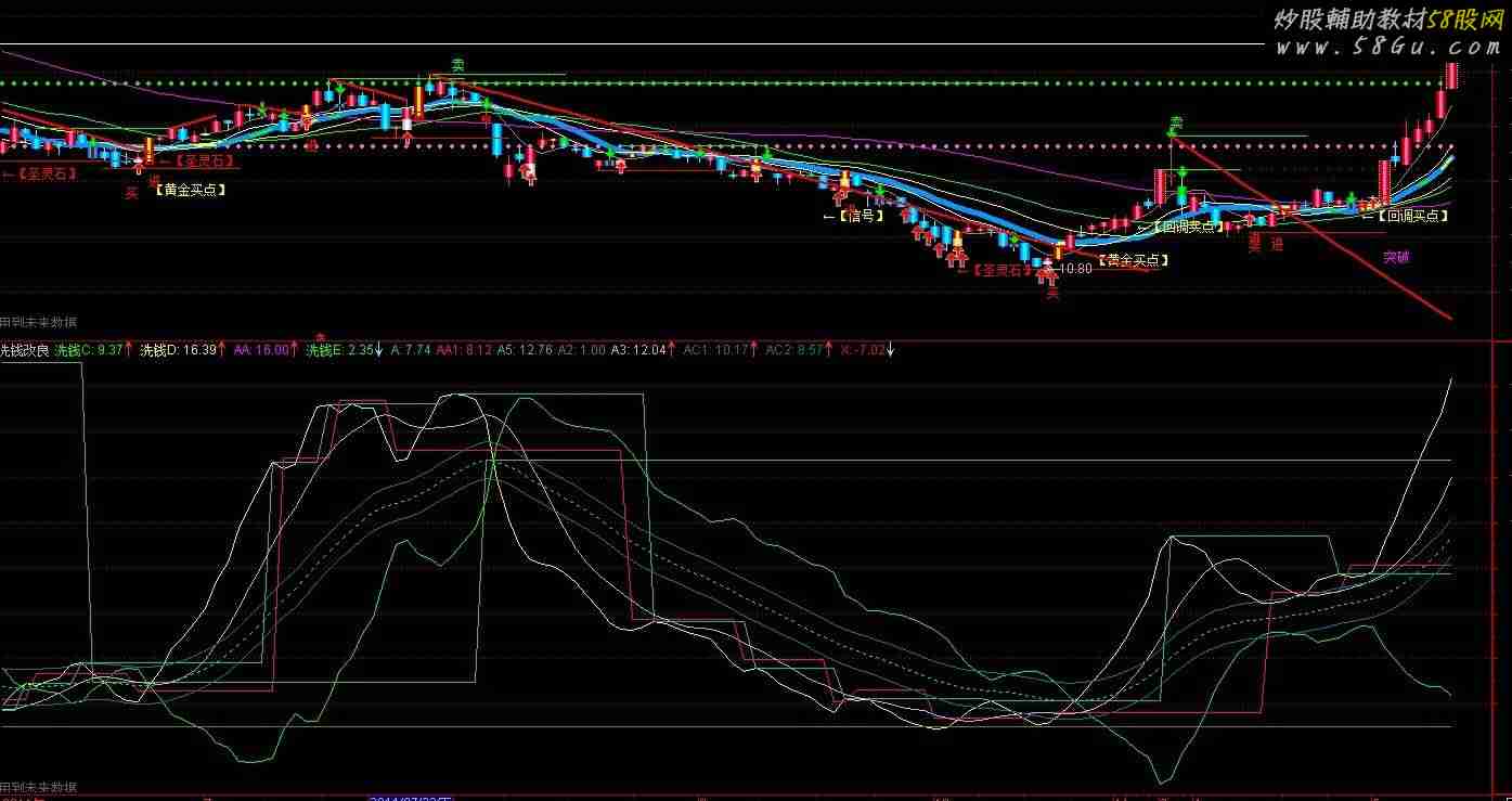 n=8.n1=1 洗钱A:=(CLOSE-LLV(LOW,32))/(HHV(HIGH,32)-LLV(LOW,32))*1.2*CLOSE; 洗钱B:=SMA(洗钱A,13,1); 洗钱C:SMA(洗钱B,5.5,1.5),DOTLINE,COLORGREEN; 洗钱D:3*洗钱B-2*洗钱C;AA:TROUGHBARS(洗钱D,5,1),NODRAW; 洗钱E:4*洗钱C-3*洗钱B; A:PEAK(洗钱D,N1,1),COLORLIBLUE;AA1:TROUGH(洗钱D,N1,1)+0.5,COLORLIMAGENTA; A5:PEAK(洗钱C,1,1),COLORLIGREEN; A2:1,COLORBROWN; A3:MA(洗钱D,N),COLORLIGRAY; AC1:洗钱C+0.8,COLORLICYAN; AC2:洗钱C-0.8,COLORLICYAN; X:-ABS(洗钱C-洗钱D),COLORRED,NODRAW; |