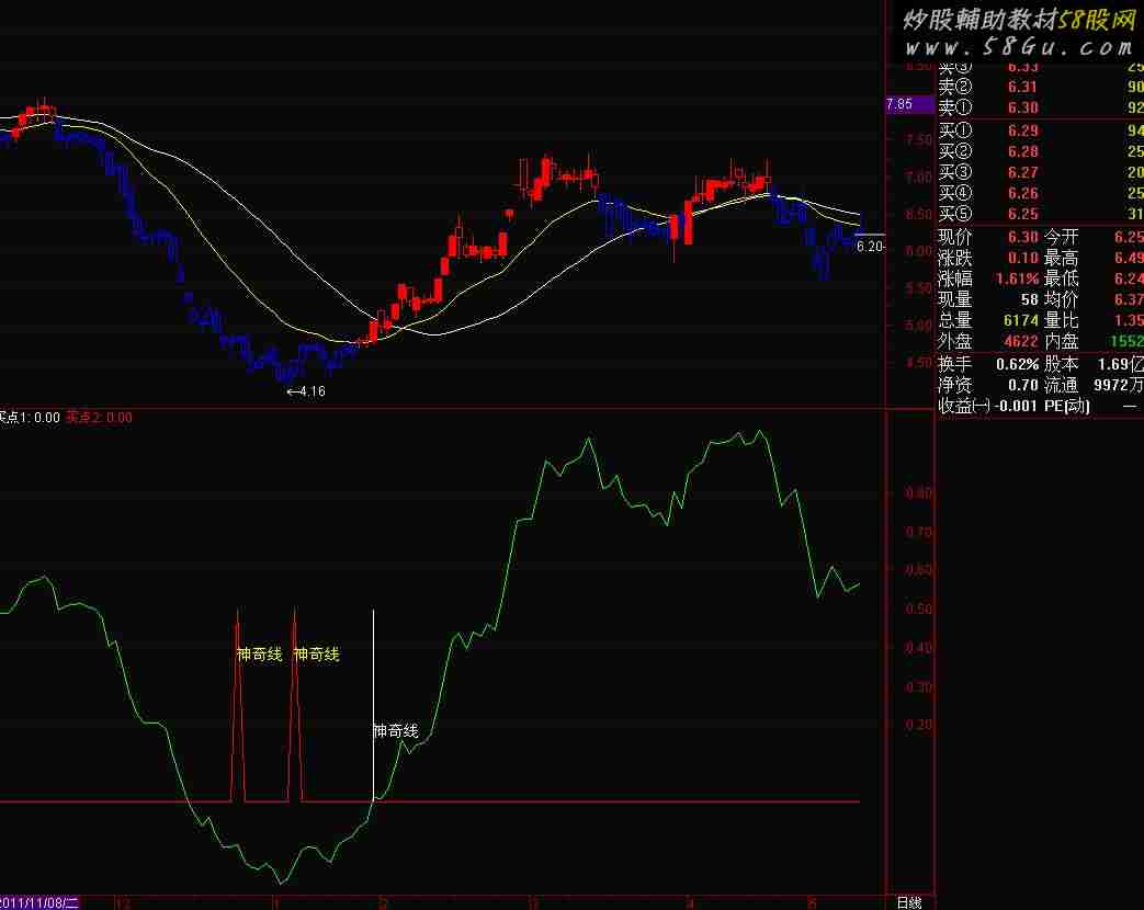 XX2:=(MA(CLOSE,80)-MA(CLOSE,13)/3); 奇线: MA((CLOSE-XX2)/XX2,1),color00ff00; 买点1: IF(CROSS(奇线,0) AND LOW/REF(HIGH,1)<1.012,0.5,0), STICK,COLORWHITE; 买点2: IF(REF(奇线,2)=LLV(奇线,20) AND REF(奇线,2)<0.071 AND REF(奇线,2)<REF(奇线,1) AND NOT(REF(LOW,1)>REF(HIGH,2) AND LOW>REF(HIGH,1)) AND CLOSE>REF(CLOSE,1),0.5,0),COLORRED; DRAWTEXT( 买点1>0,0.2 ,'神奇线'),COLORWHITE; DRAWTEXT( 买点2>0,0.4 , '神奇线'),COLORyellow; |