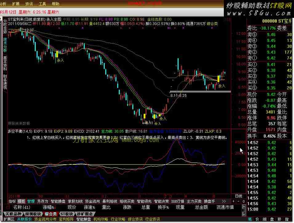 改自网络朋友的,受之,报之。指标配使用说明情况EXP1:EXPMA(CLOSE,8); EXP2:EXPMA(CLOSE,13); EXCD:(EXP1-EXP2)*22000,COLORWHITE; {主力仓位} MTR:=EXPMEMA(MAX(MAX(HIGH-LOW,ABS(HIGH-REF(CLOSE,1))),ABS(REF(CLOSE,1)-LOW)),21); HD:=HIGH-REF(HIGH,1); LD:=REF(LOW,1)-LOW; DMP:=EXPMEMA(IF(HD>0&&HD>LD,HD,0),21); DMM:=EXPMEMA(IF(LD>0&&LD>HD,LD,0),21); 主力线:DMP*100/MTR; 散户线:DMM*100/MTR; 主力仓位:(主力线-散户线)*1000,COLORBLUE; {主力控盘} VAR1:=(CLOSE*2+HIGH+LOW)/4; VAR2:=EMA(VAR1,13)-EMA(VAR1,34); VAR3:=EMA(VAR2,5); ZLQP:(-2)*(VAR2-VAR3)*3.8; ZLKP:2*(VAR2-VAR3)*3.8; 主力控盘:(ZLKP-ZLQP)*10000,COLORRED ; DRAWTEXT_FIX(1,0.99,0.01,1,'1、红线上穿白线买入,红线蓝线发生背离效果更佳;2、红蓝白三线位于最低点买入,最高点卖出;3、黄线为多空平衡线。'); |