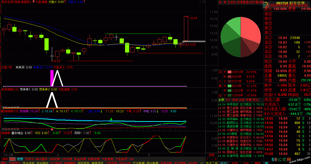 VAR1:=VOL/((HIGH-LOW)*2-ABS(CLOSE-OPEN)); 主动买盘:=IF(CLOSE>OPEN,VAR1*(HIGH-LOW),IF(CLOSE<OPEN, VAR1*((HIGH-OPEN)+(CLOSE-LOW)),VOL/2)); 主动卖盘:=IF(CLOSE>OPEN,0-VAR1*((HIGH-CLOSE)+(OPEN-LOW)), IF(CLOSE<OPEN,0-VAR1*(HIGH-LOW),0-VOL/2)); 主动:=SUM(主动买盘,0)/SUM(主动卖盘,0)*-1; 低主5:=LLV(主动,5); 动比:=主动-低主5; 高动5:=6/HHV(动比,5); 主动心:=高动5*动比; K1:=主动心+1-REF(主动心,1)>0; K2:=主动心+1-REF(主动心,1)<0; 主动心向:=主动心*K1-主动心*K2;FF:=CLOSE-REF(CLOSE,1); A:=MA(VOL*FF,2); A0:=MA(VOL*FF,3); A1:=MA(VOL*FF,5); A2:=MA(VOL*FF,10); A3:=MA(VOL*FF,20); A4:=MA(VOL*FF,30); B:=A-REF(A,1); B0:=A0-REF(A0,1); B1:=A1-REF(A1,1); B2:=A2-REF(A2,1); B3:=A3-REF(A3,1); B4:=A3-REF(A4,1); 量价相合:=(B>0)+(B0>0)+(B1>0)+(B2>0)+(B3>0)+(B4>0); YES:=(量价相合>1)*量价相合*(主动心向>1 OR 主动心>60); 量价相合选股:YES>=REF(YES,1) AND YES>5;