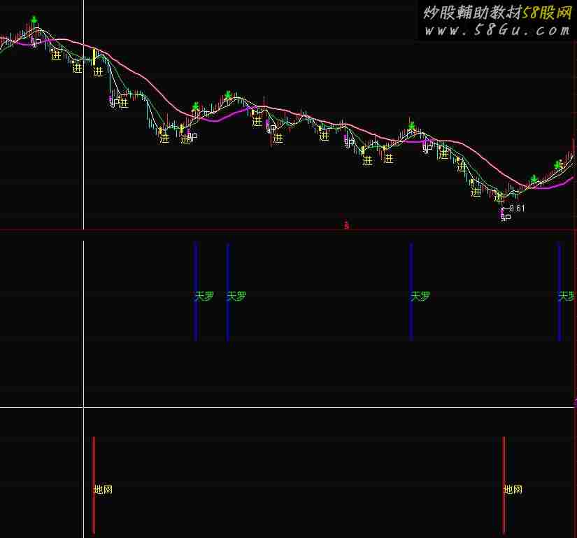 BB1:=LLV(LOW,5)=LLV(LOW,45) AND CLOSE>=OPEN*1.04; CC1:=REF(CLOSE,1); CC2:=SMA(MAX(CLOSE-CC1,0),6,1)/SMA(ABS(CLOSE-CC1),6,1)*100; 卖出:=CROSS(80,CC2); STICKLINE(卖出,3,2,1,1),LINETHICK2,COLORBLUE; DRAWTEXT(卖出 AND REF(卖出,1)=0,2.5,'天罗'),COLORGREEN; STICKLINE(BB1,0,1,1,1),LINETHICK2,COLORRED; DRAWTEXT(BB1 AND REF(BB1,1)=0,0.5,'地网'),COLORYELLOW;